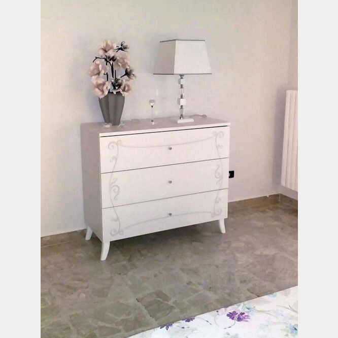 Comò moderno MADE IN ITALY, colore bianco avatar con frontali serigrafati e piedini in legno bianco fotografato dai nostri clienti. Gli acquisti dei clienti zenzero nelle foto reali. Tutti i prodotti sono realizzati con pannelli ecologici certificati FSC.