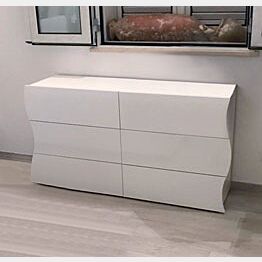 Il prodotto è una madia / comò di design moderno e funzionale adatto sia in soggiorno che in camera da letto, composto da 6 cassetti sagomati, tutto nella finitura bianco laccato lucido.
