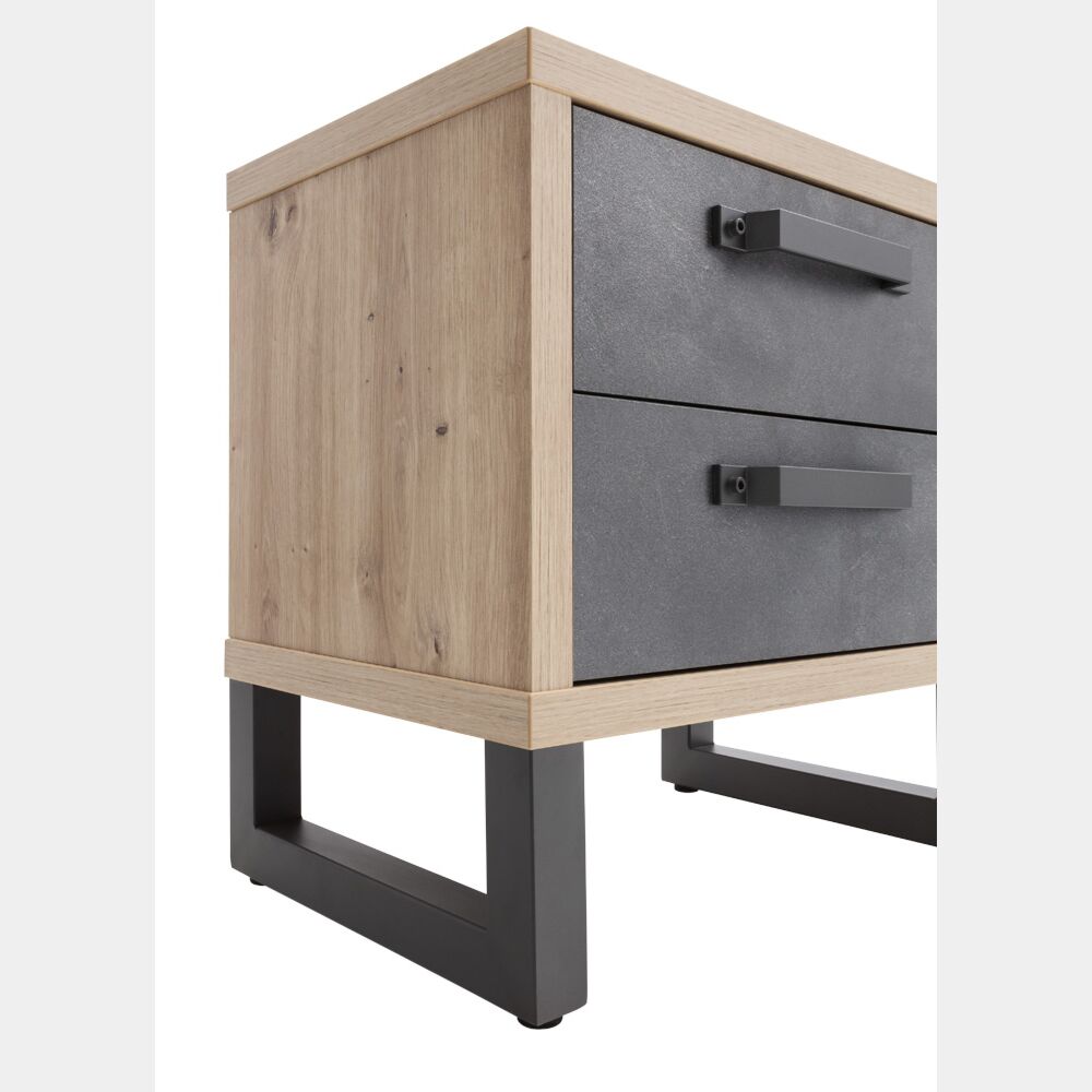 Comodino stile Industry con 2 cassetti in finitura Rovere e Grigio smoke