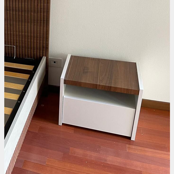 Comodini ad un cassetto con vano a giorno con piano Noce Dark e finitura scocca bianco opaco.Il comodino della Collezione Mondo si presenta nella finitura bianco opaco con il top del ripiano in finitura Noce Dark. Tra il cassetto e il ripiano noce c'è un piccolo vano a giorno in cui poter riporre i propri oggetti. Il comodino ha la struttura e cassetto con uno spessore di 22mm. La convenienza non finisce qui, il comodino oltre alla solida struttura ha anche il cassetto con le guide ammortizzate. Ai comodini è possibile aggiungere la luce LED creando un mondo di effetti.