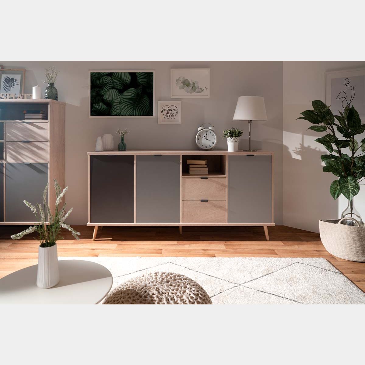 Questa madia è composta da 3 ante in diverse tonalità di grigio e 2 cassetti.