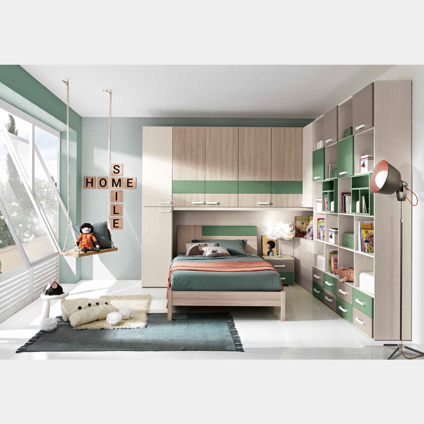Cameretta a ponte con angolo per ragazzi completa Riccardo, finitura Betulla, Olmo, Avio e Verde Mela