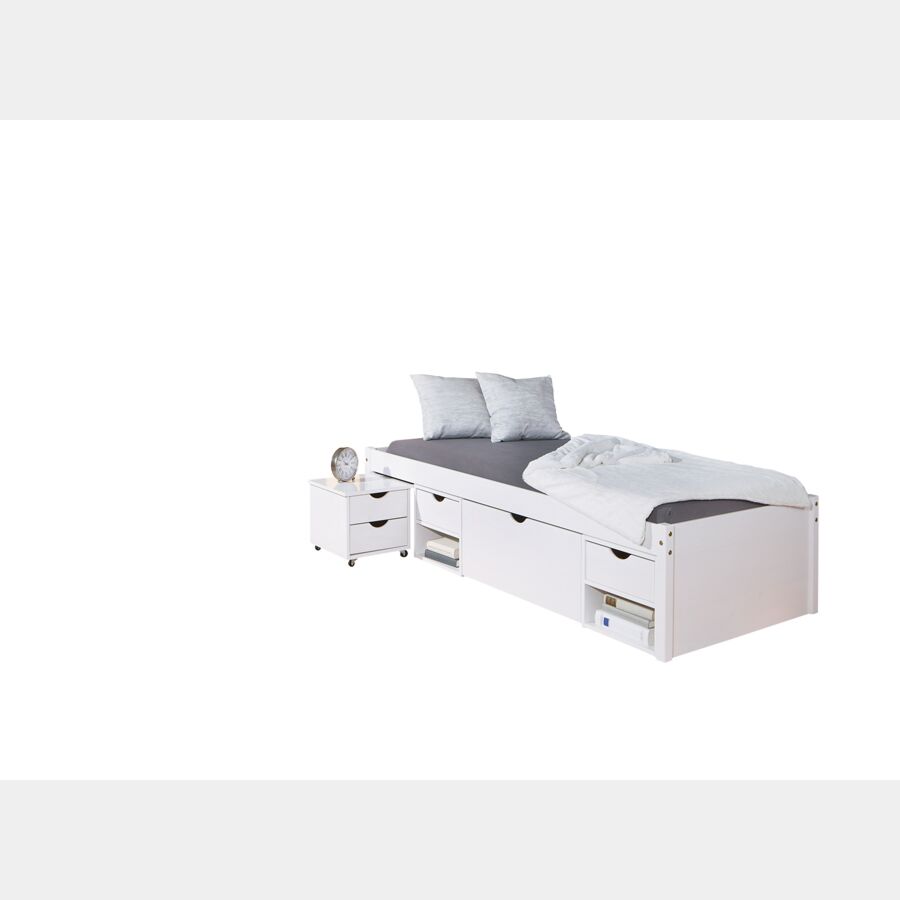 Ampio letto contenitore che offre grande possibilità di deposito: un grande cassetto su ruote, quattro ripiani con cassetti e due comodini su ruote, i cassetti sono intercambiabili e possono indifferentemente essere posti in ogni posizione.