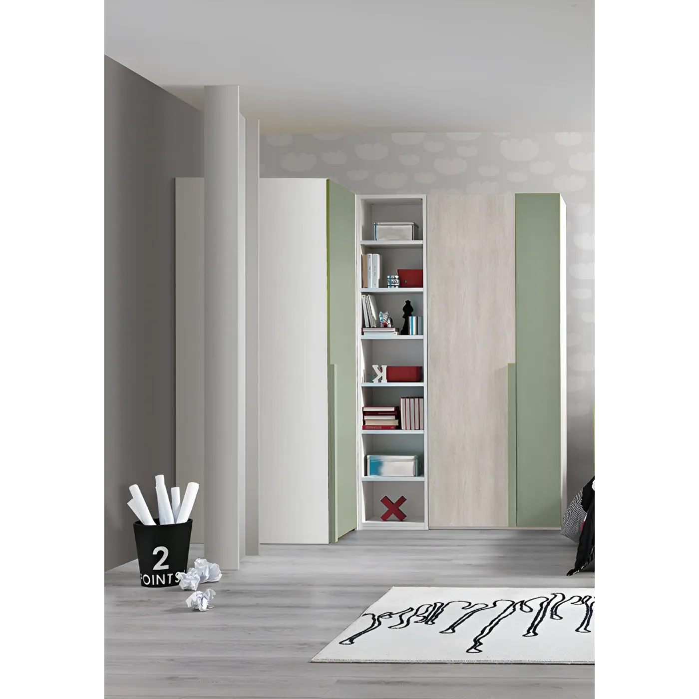 Armadi ad angolo con libreria in finitura Bianco frassino, Gessato cenere e Salvia