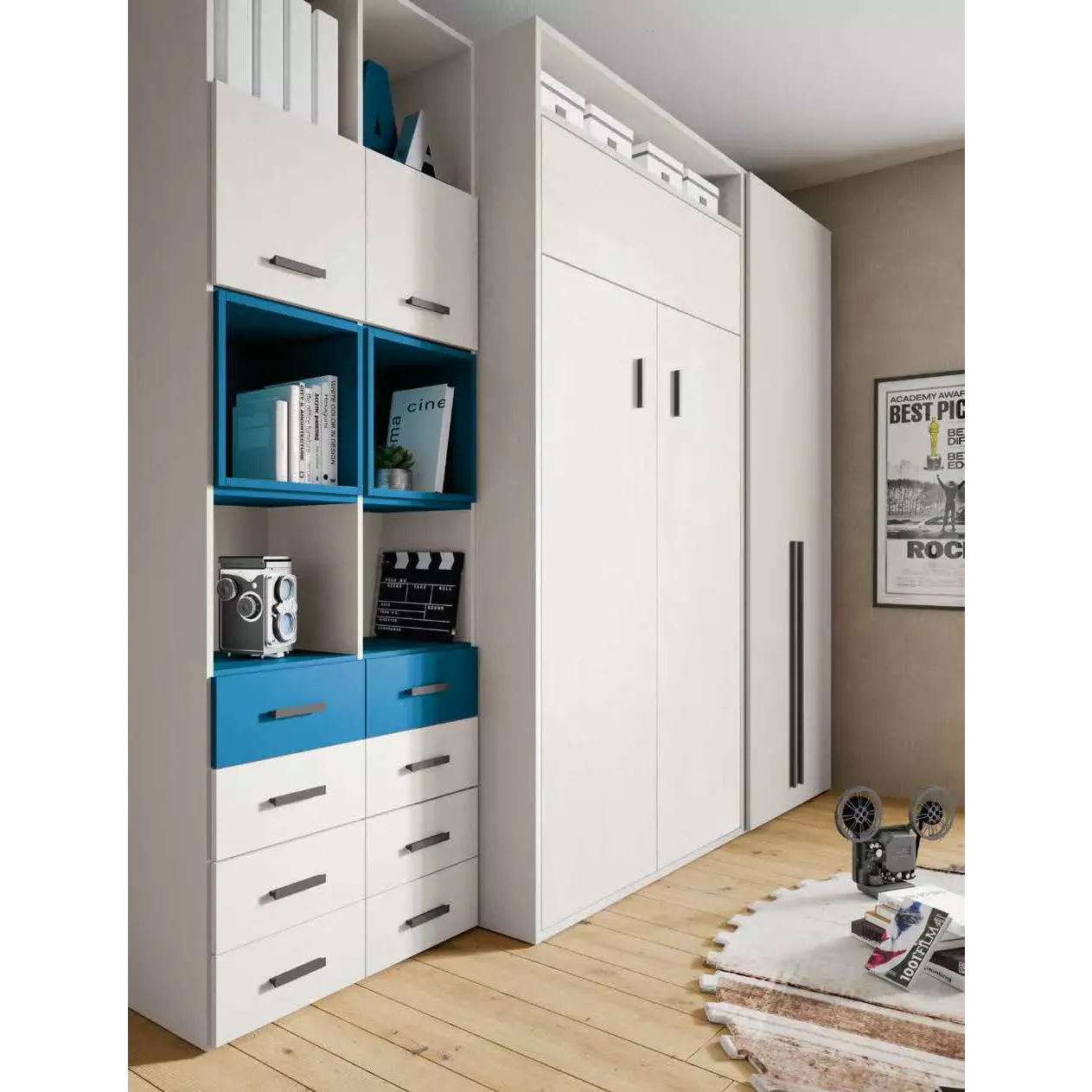 La composizione prevede due librerie con ante, vani a giorno e cassetti, un letto salvaspazio con vano a giorno superiore e un modulo a due ante, dotato di ripiano centrale e due tubi appendiabiti.
