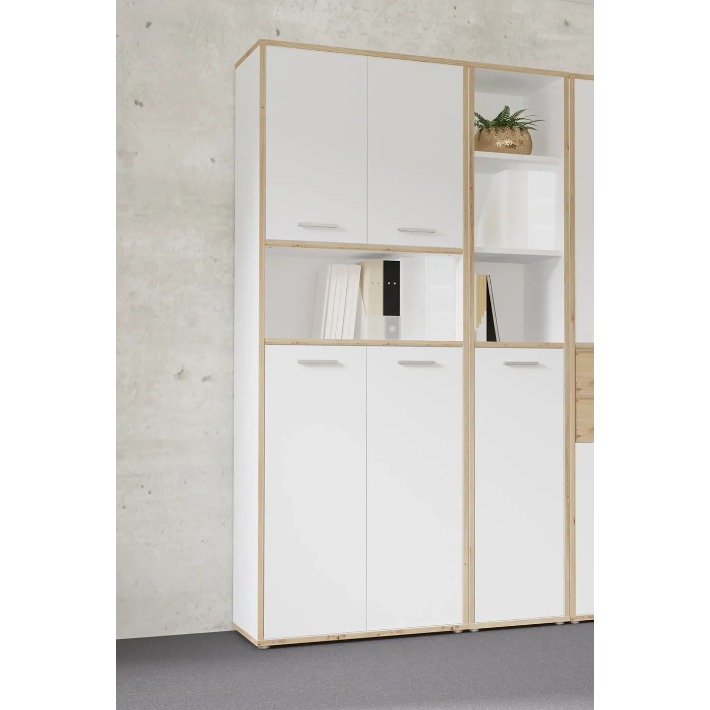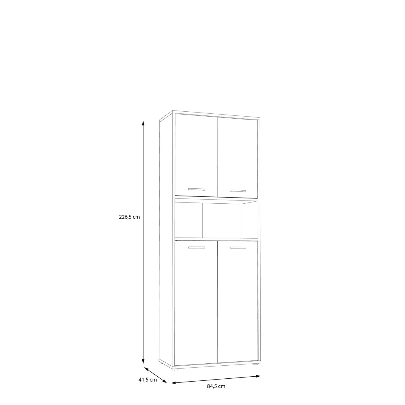 Questo armadietto da ufficio rivaleggia tranquillamente a testa alta con altri prodotti di simile fattura e tipologia grazie alla sua dotazione di 3 ripiani. Diviso in due parti (entrambe celate da 2 ante per un totale di 4) da un largo vano a giorno, i primi 2 ripiani si collocano in quella superiore mentre il terzo nella più grande e inferiore.