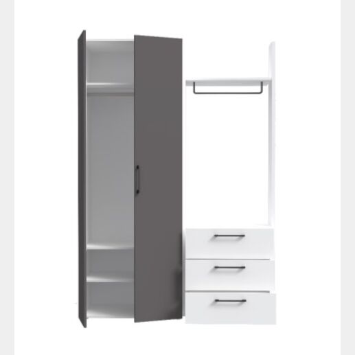 La composizione d'ingresso prevede un armadietto a 2 ante ed un appendiabiti con 3 cassetti inferiori. L'armadietto è dotato di un tubo appendiabiti e di 3 ripiani centrali, le maniglie sono in metallo nero. Come optional è possibile aggiungere alla composizione una scarpiera laterale, in finitura Bianca.
