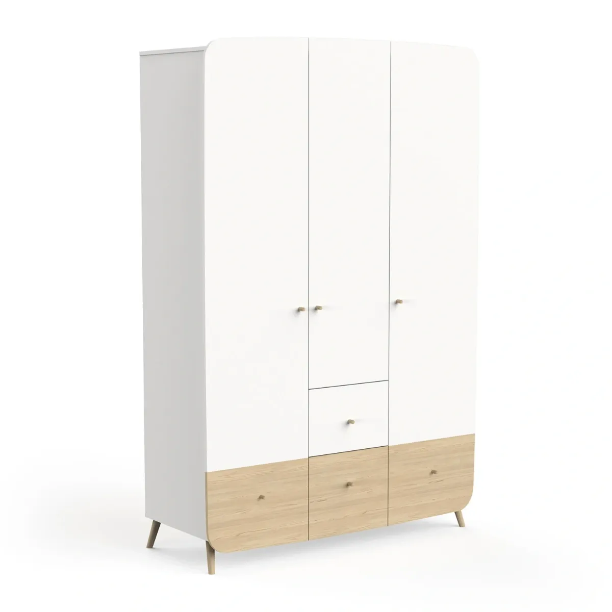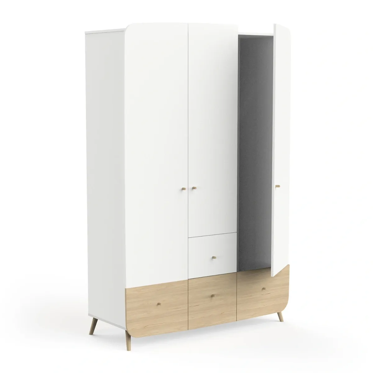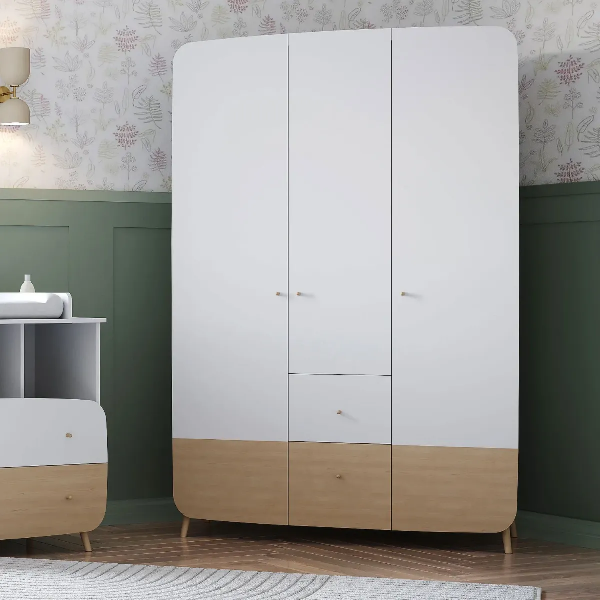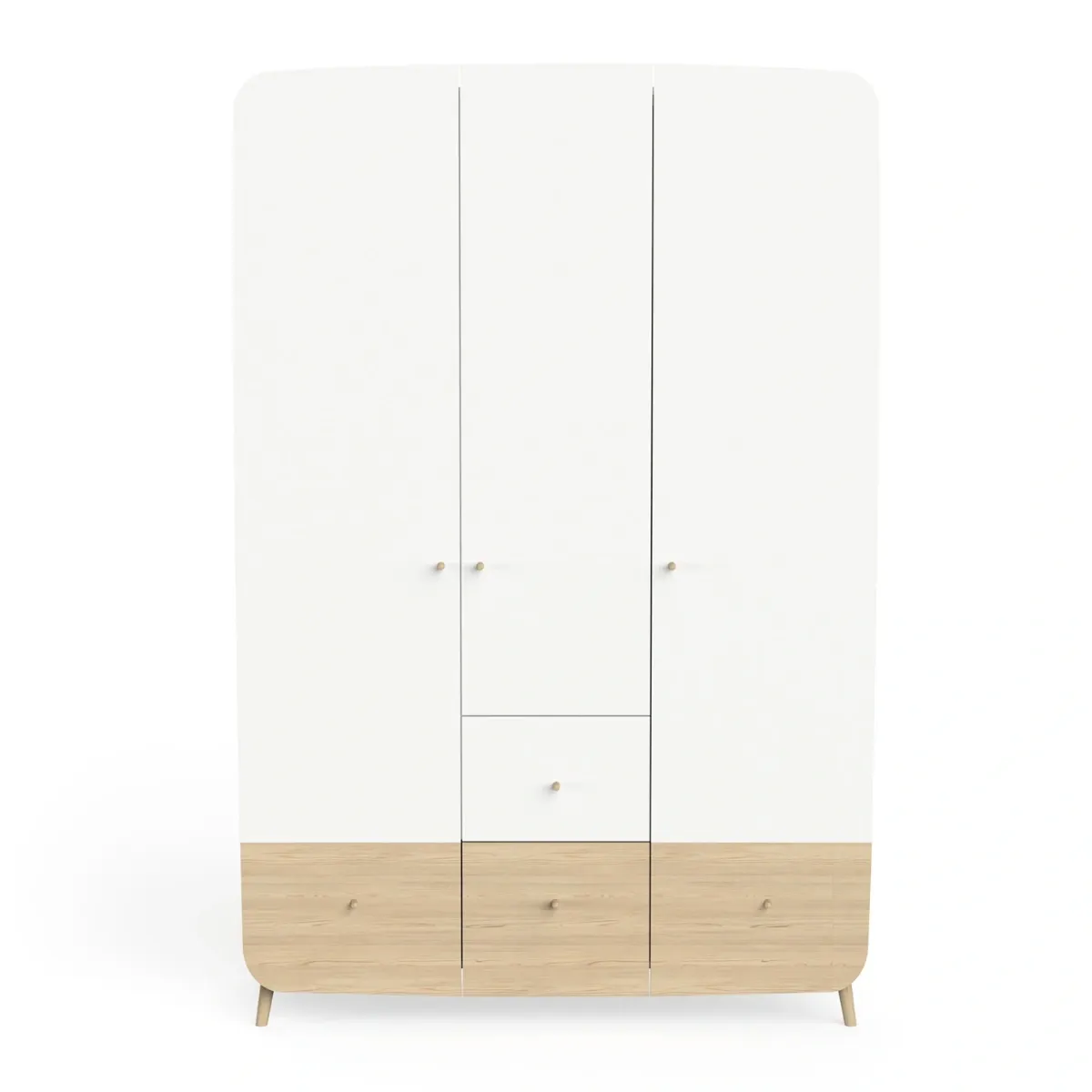 L'armadio è caratterizzato da tre ante battenti e quattro cassetti inferiori, la suddivisione interna dello spazio assicura un ampio spazio contenitivo per abbigliamento, bianchieria, coperte e giochi.