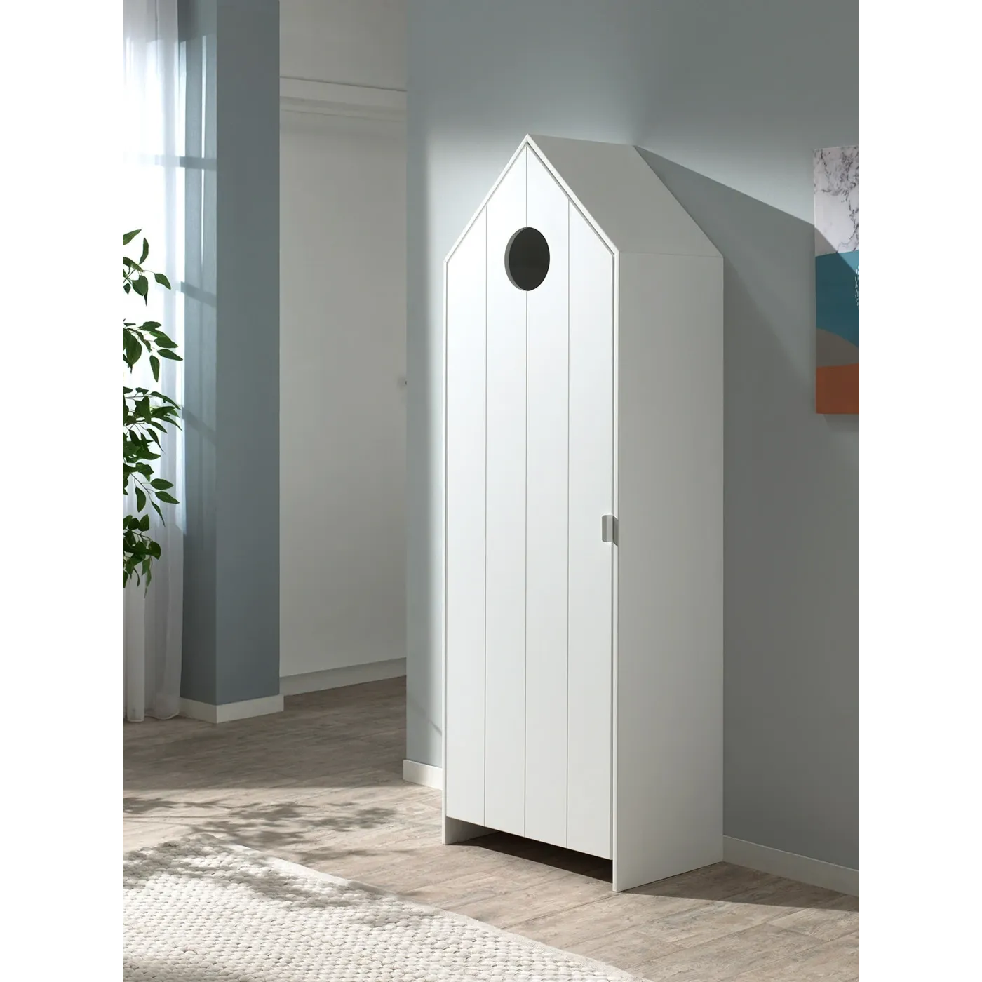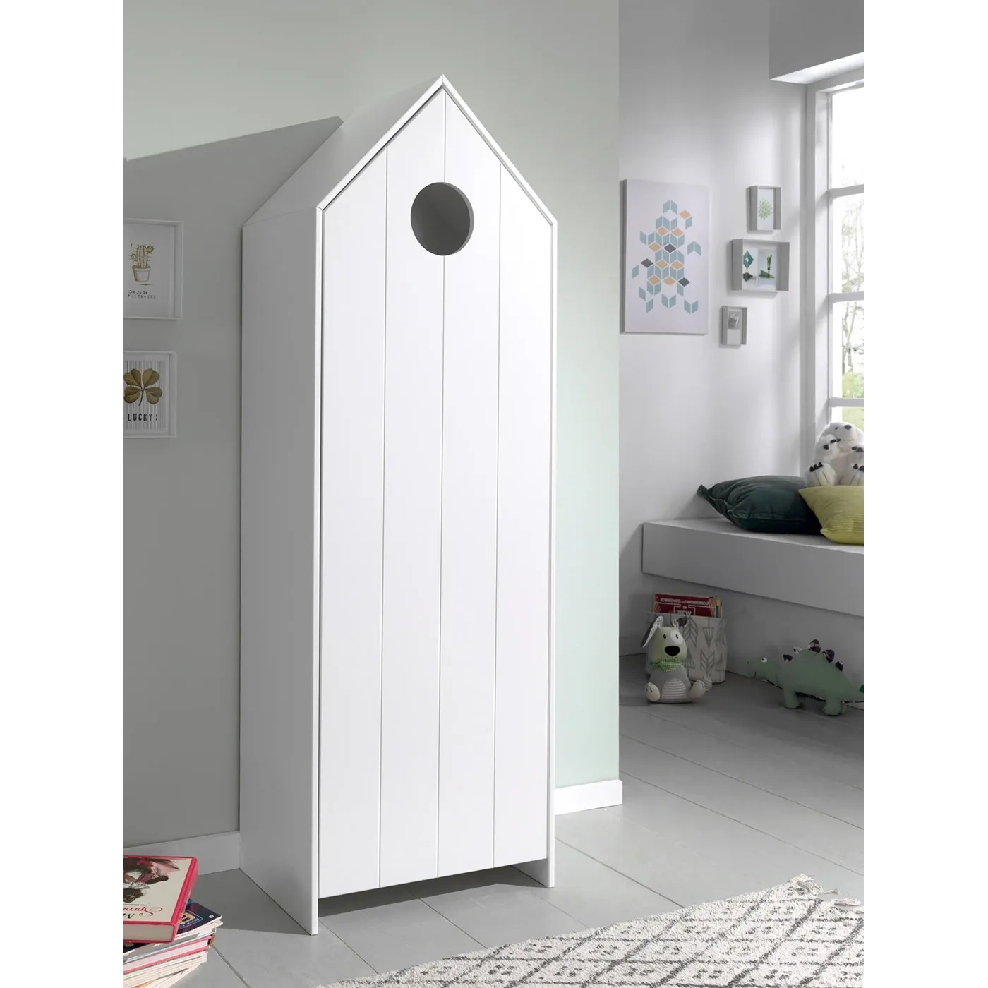 Questa casetta con porta bianca può essere utilizzata come armadio o guardaroba. Combinabile perfettamente con le sue altre versioni disponibili in diversi colori pastello. Questo armadio attira l'attenzione in ogni cameretta in cui venga posto.