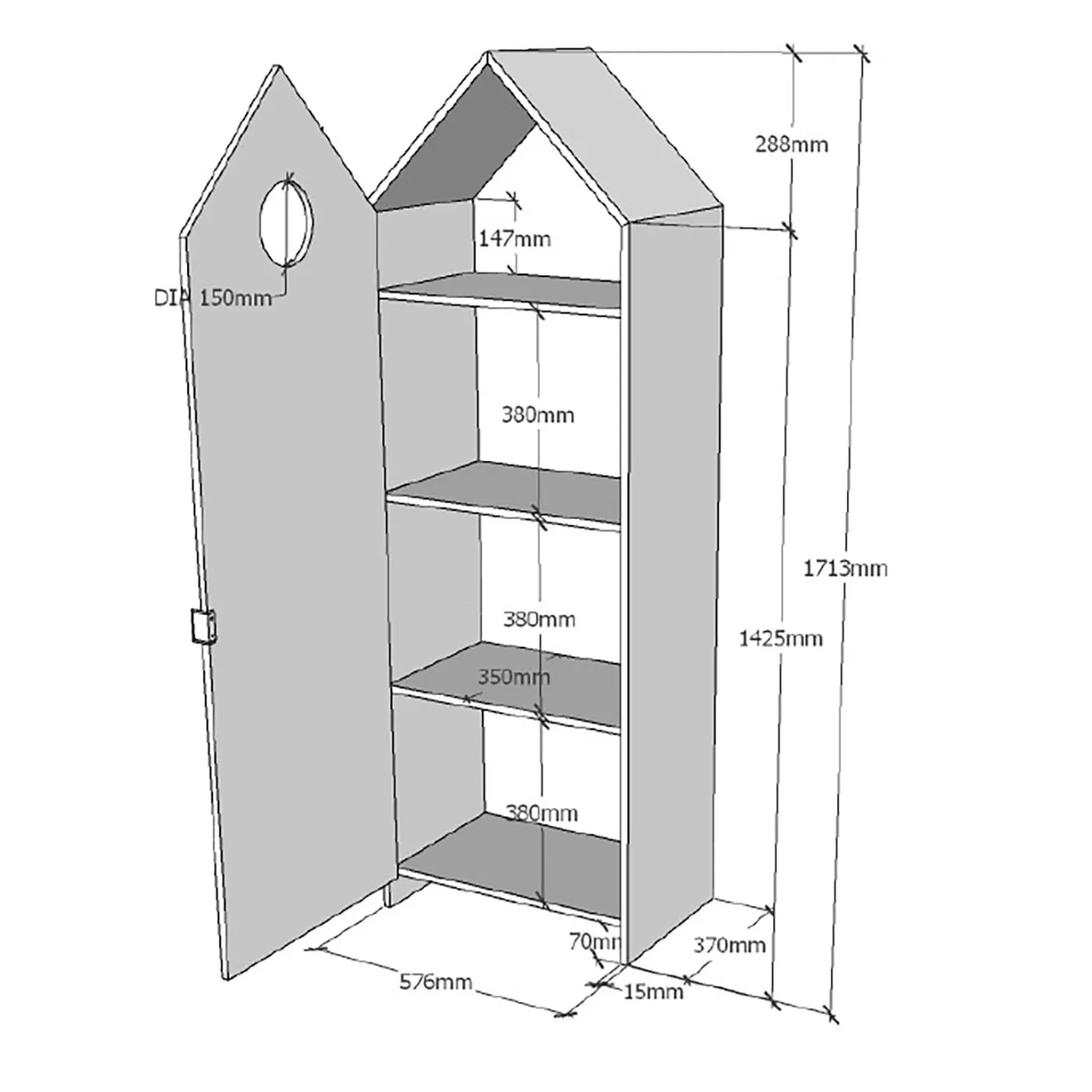 Armadietto a forma di casetta ideale per arredare la cameretta di un bambino grazie all'innovativo e divertente design che lo rende adatta ad essere collocata in simili ambienti, magari in pendant con mobili dall'estetica simile. Si dimostra essere un pratico alleato per mantenere l'ordine nella camera da letto dei vostri figli in virtù dei 3 ripiani rimovibili e di un appendiabiti fissabile a quello più alto che esso mette a disposizione. Dal punto di vista della bellezza eccelle grazie alla presenza dell'originale buco al centro dell'anta, delle righe orizzontali imitanti le venature del legno e alla colorazione di Bianco che lo caratterizza.