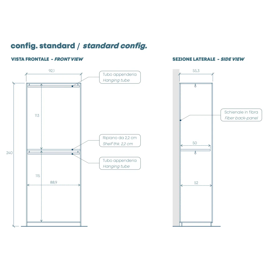 L'armadio è dotato di un ripiano e due tubi appendiabiti, tramite configuratore è possibile personalizzare l'allestimento interno richiedendo ulteriori ripiani, cassettiere, scaffalature, servetti o luce led.