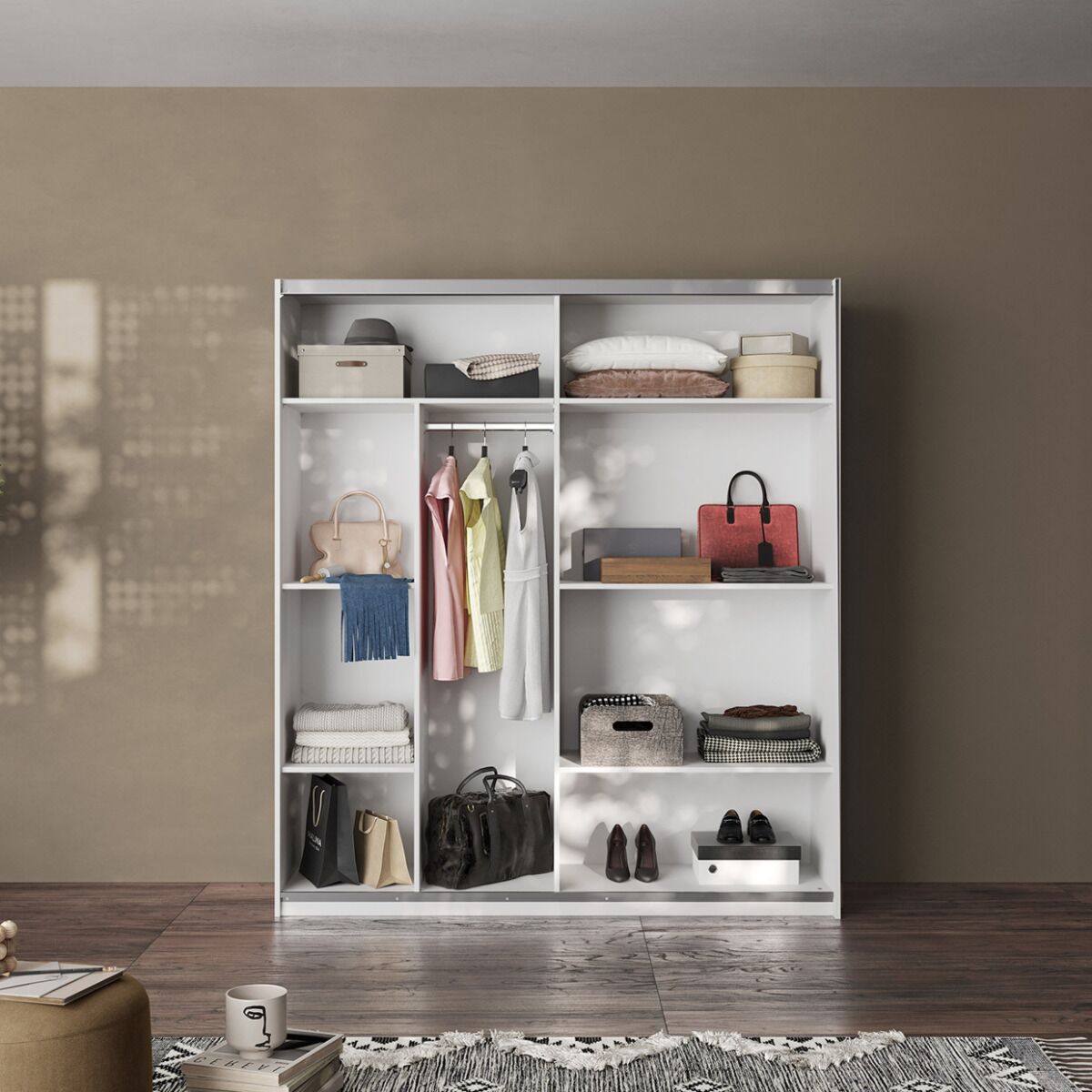 L'anta specchio e la finitura Bianco lucido caratterizzano l'armadio, donandogli uno stile moderno e di impatto, per questo può essere utilizzato anche in ingresso, come guardaroba.
