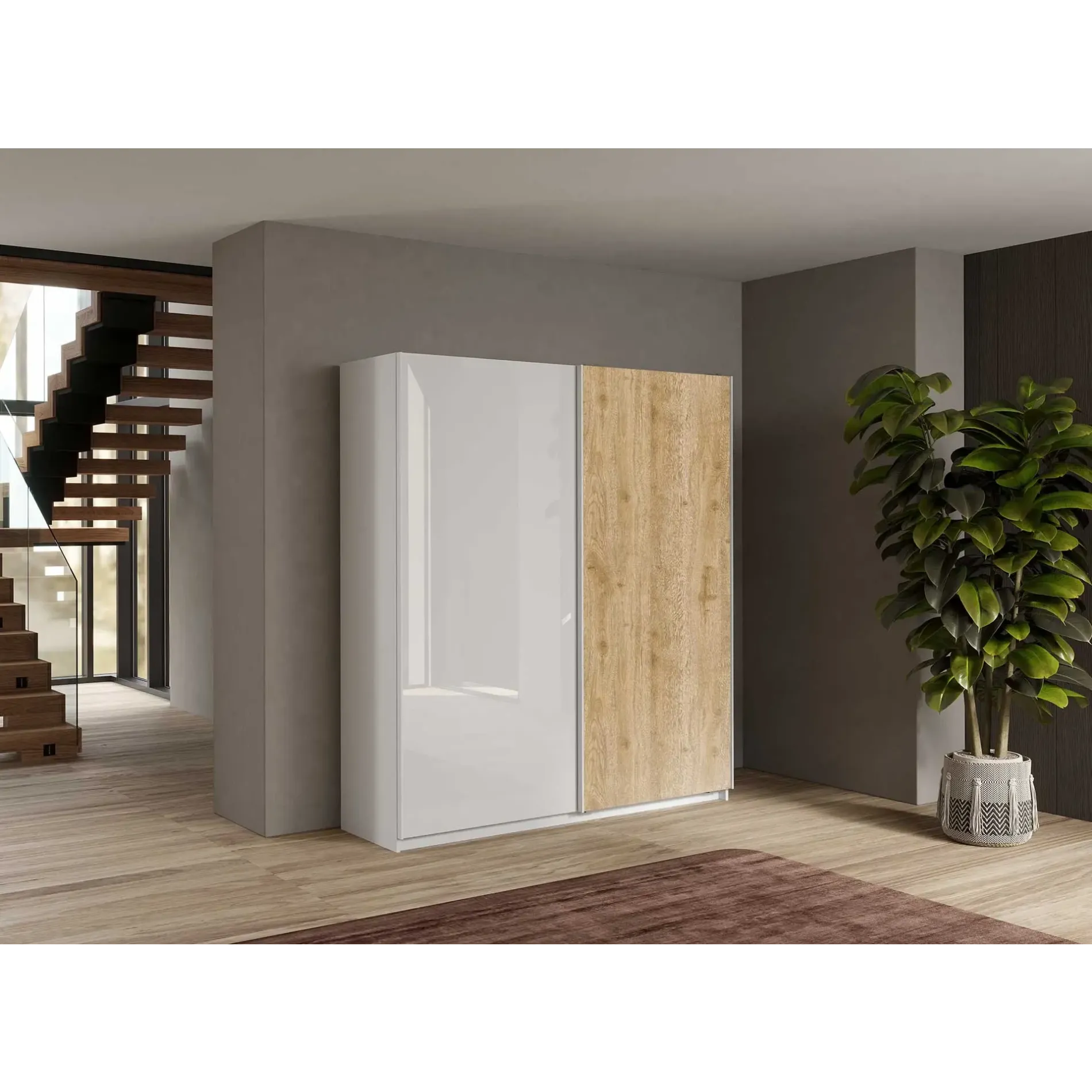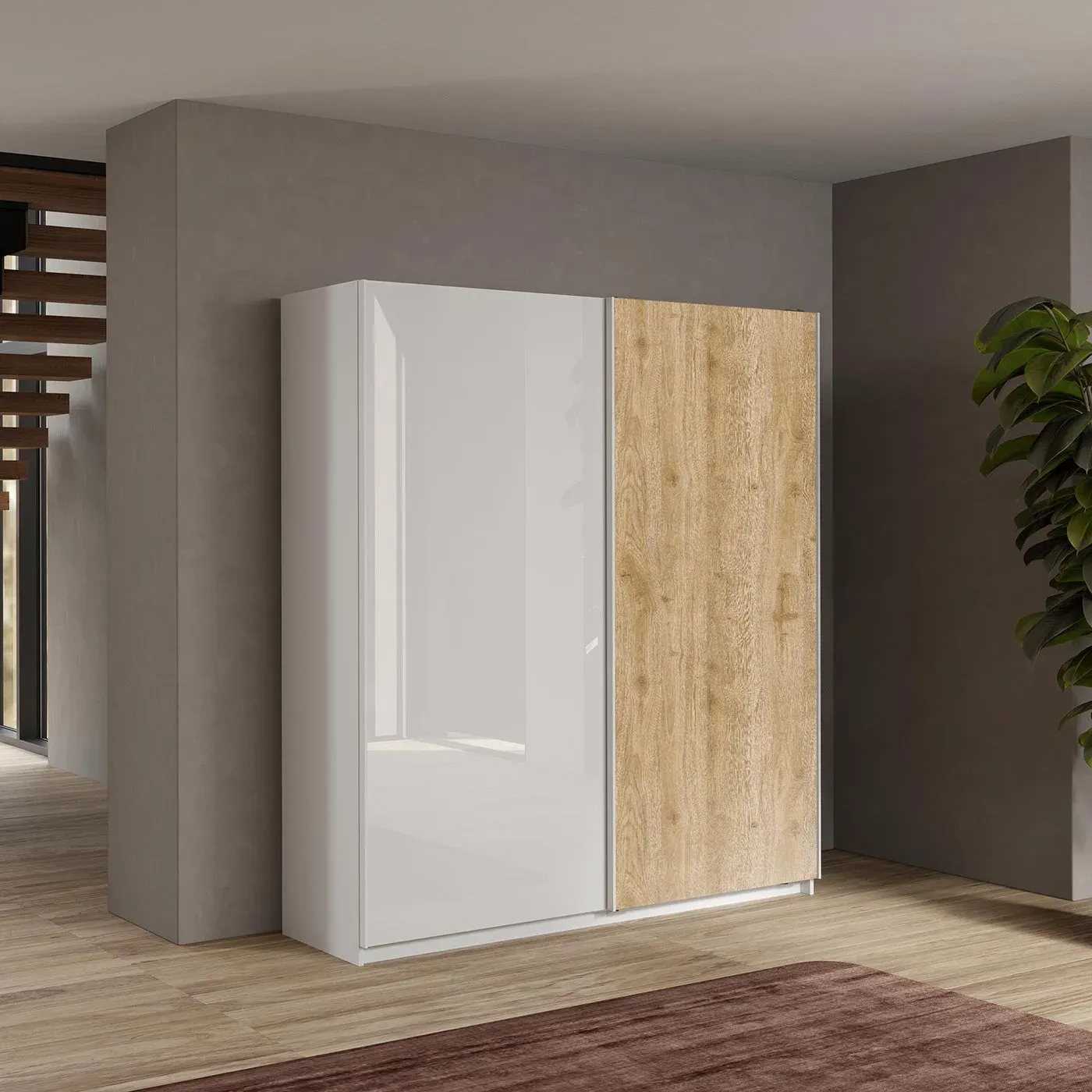 Design semplice e calde finiture caratterizzano l'armadio scorrevole, assicurando un'estrema versatilità: le linee pulite e le dimensioni contenute fanno si che l'armadio si possa adattare a vari ambienti della casa, come la camera padronale, la cameretta oppure un ingresso.