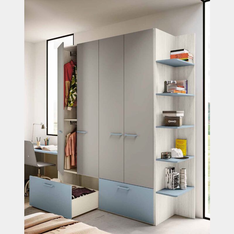 Progettato anche per ambienti dalle dimensioni limitate l'armadio offrirà un ampio spazio di appoggio per vestiti, giochi, cuscini o coperte, offrendo al contempo una soluzione d'arredo ricercata e allegra. A completare l'armadio è la libreria terminale a 5 mensole, ideale per mettere in risalto le proprie passioni, posizionando ad esempio libri, dvd o souvenier.