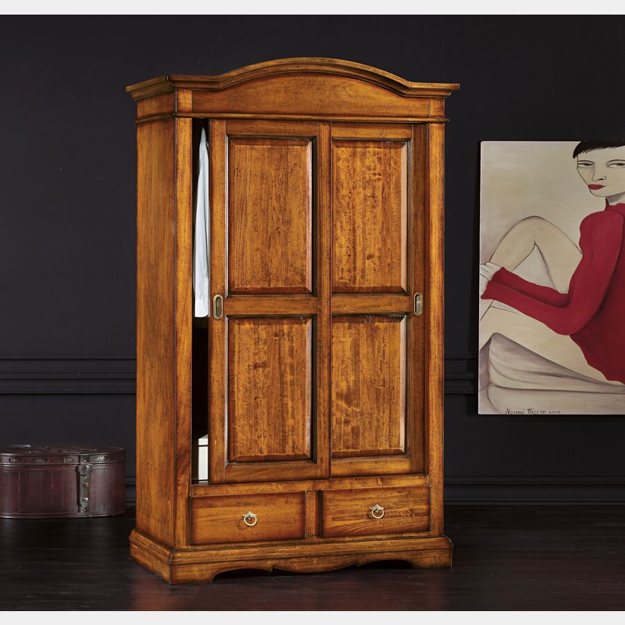 Armadio di pregevole fattura a 2 ante scorrevoli. La parte inferiore viene proposta con due cassetti portabiancheria di ampie dimensioni. Finitura Noce Arte Povera.