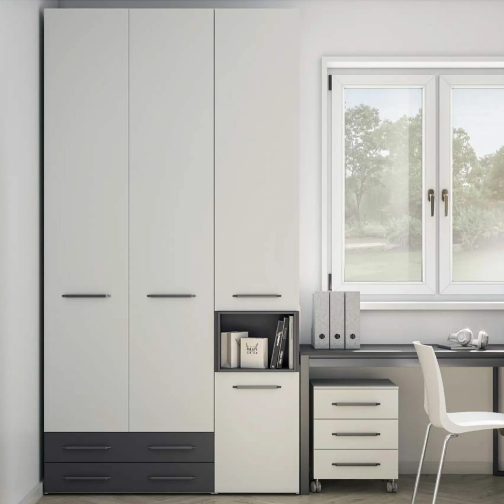 Armadio 4 ante, 2 cassetti e vano, Bianco luce e Antracite