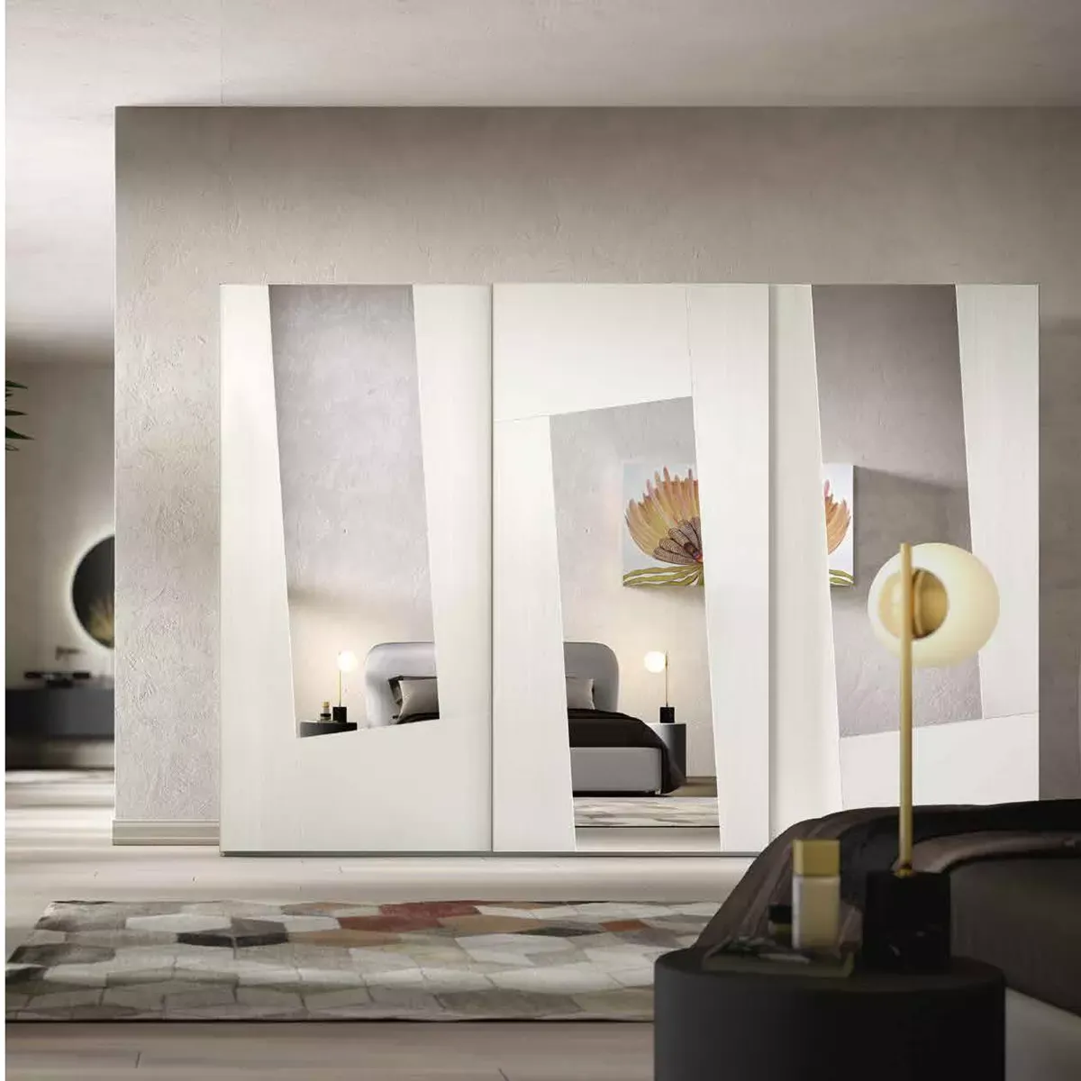 E' un armadio scorrevole dal design esclusivo, i tagli obliqui donano dinamicità e movimento alle grandi ante. La porzione di specchio regala luminosità e interessanti giochi compositivi che completano il design dell'armadio.