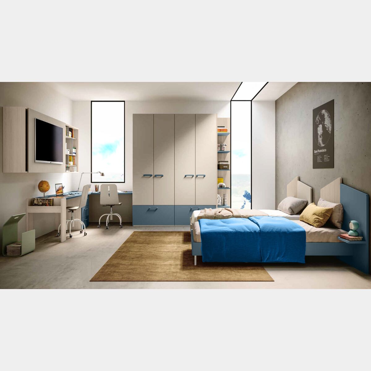 Le finiture proposte sono Olmo per la struttura, Orzo per le ante e Petrolio per i cassettoni e ripiani della libreria. L’unione di queste tonalità genera armonia e carattere per donare alla cameretta un tocco elegante e moderno. E’ però possibile sostituire le finiture scegliendo i colori tra quelli presenti nella tabella.