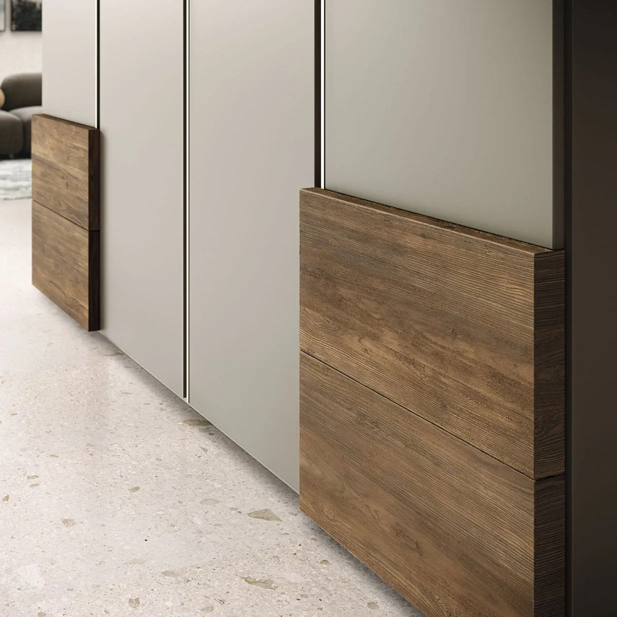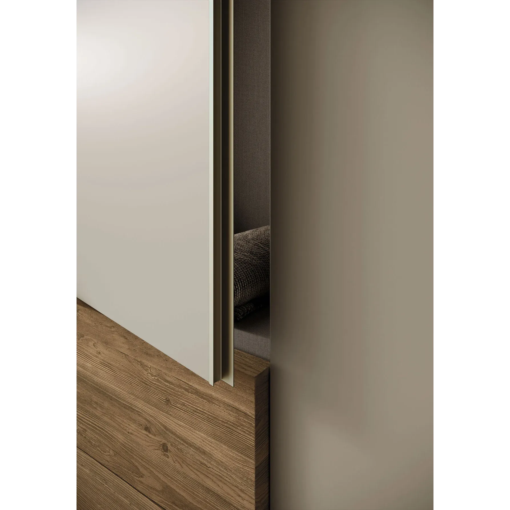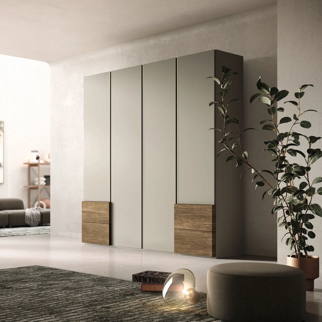 Calde finiture caratterizzano l'armadio, assicurando alla camera da letto accoglienza ed eleganza. I cassetti sono proposti in tinta Abete, mentre struttura e frontali in materico Duna, l'ampia gamma di finiture disponibili consente una completa personalizzazione dell'armadio, per adattarlo ai propri gusti.
