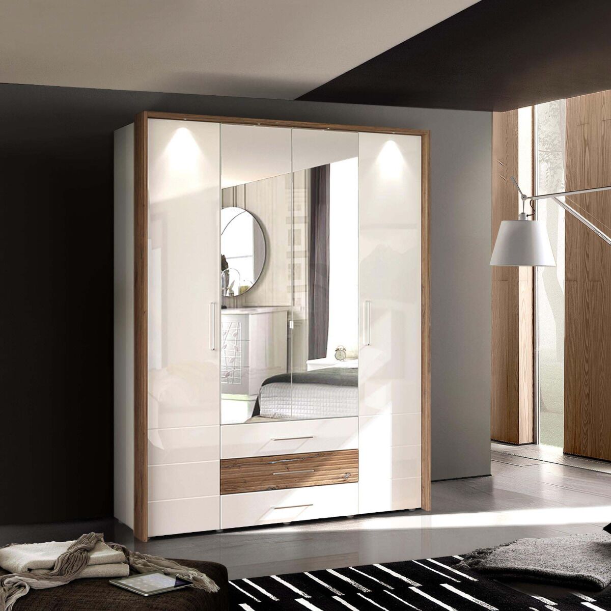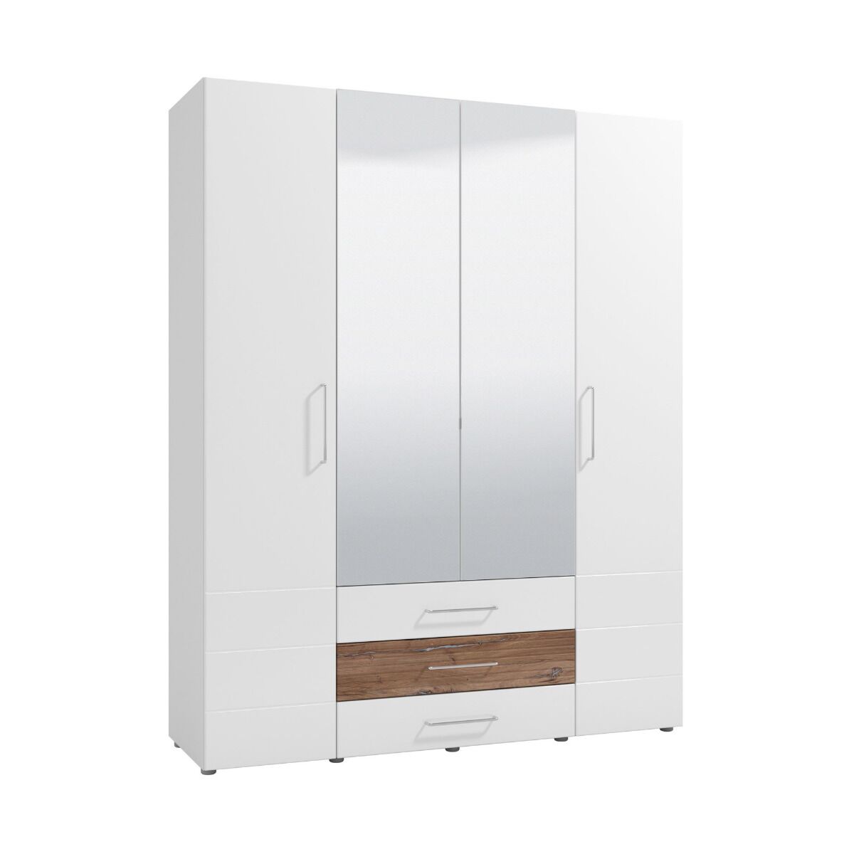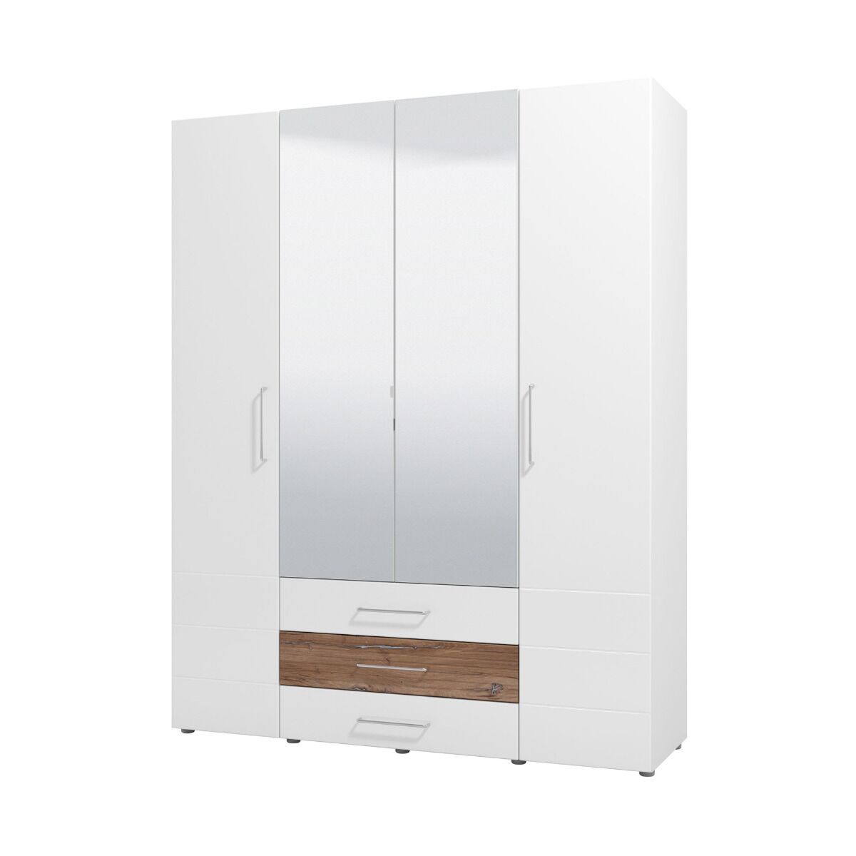 Armadio 4 ante battenti e 3 cassetti con specchio, bianco e quercia
