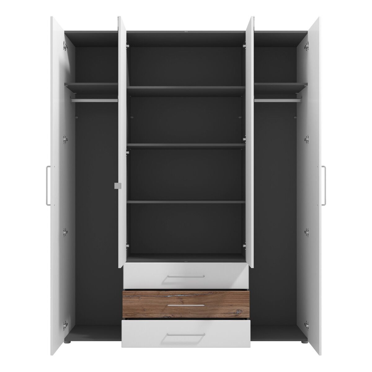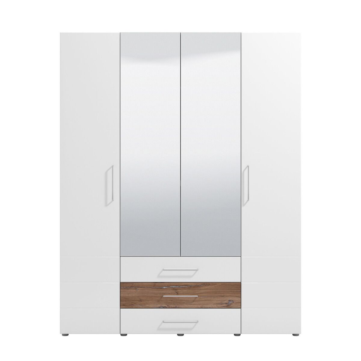 L'armadio è composto da 4 ante battenti: le due centrali più corte sono a specchio e completate da 3 capienti cassetti.