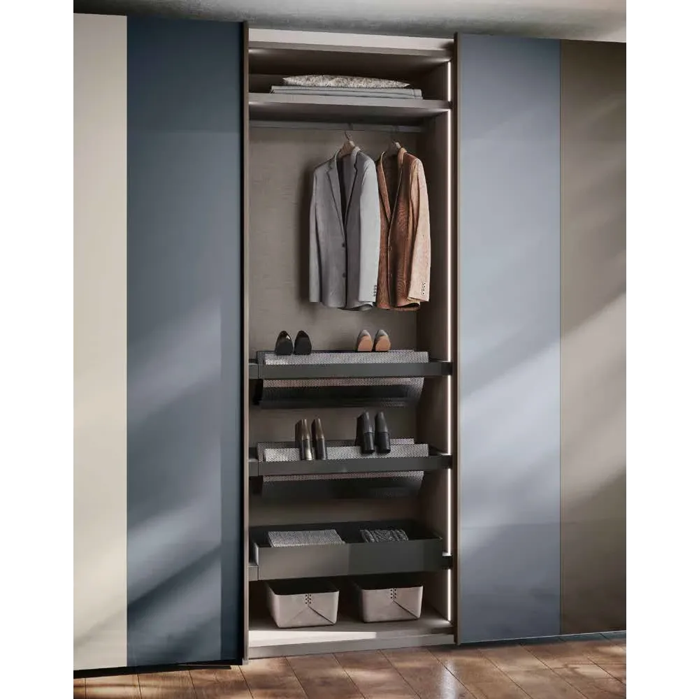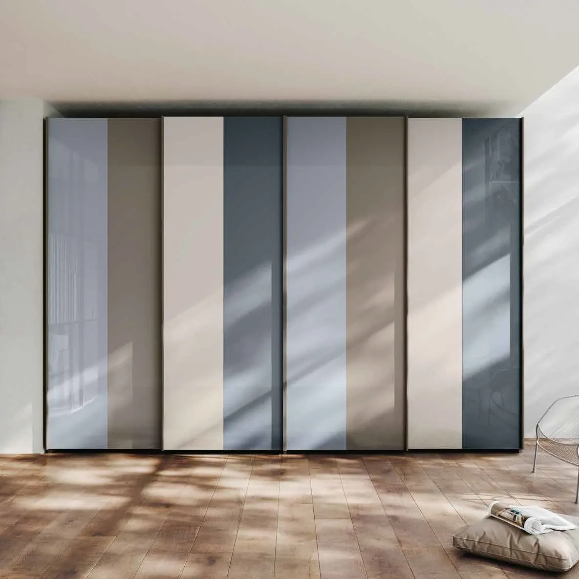 La combinazione di diverse tonalità, dal blu al grigio, crea un effetto visivo dinamico e moderno. Le diverse tonalità, inoltre, permettono di personalizzare l'armadio e di integrarlo al meglio nell'arredamento della stanza.