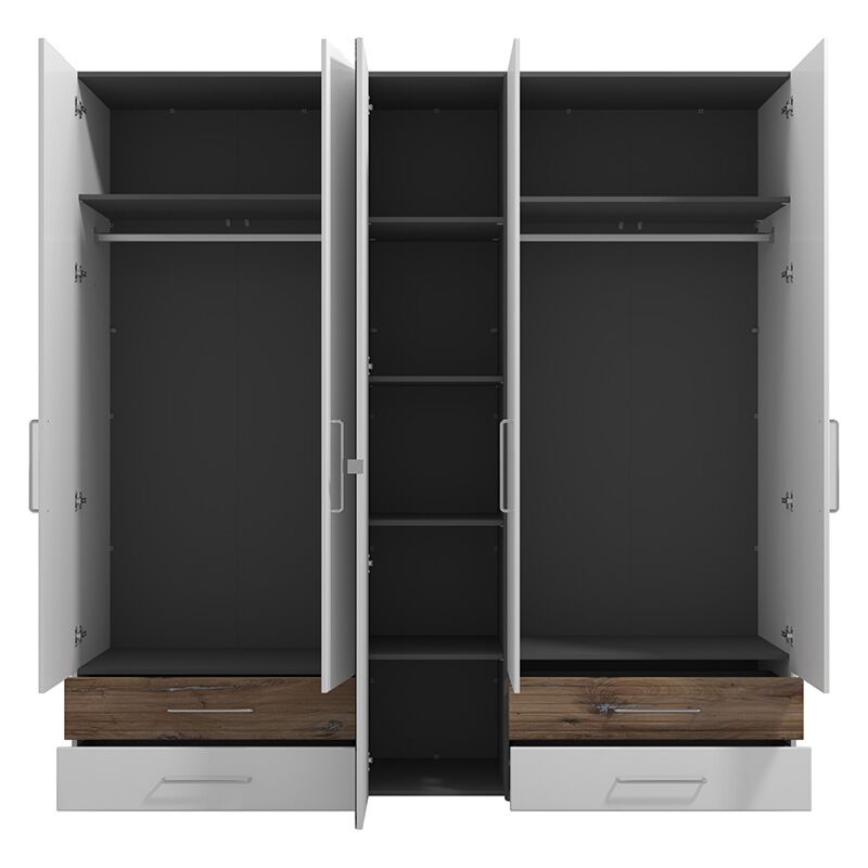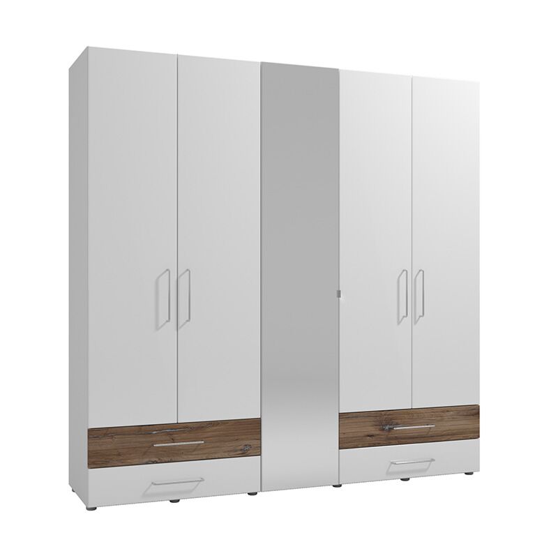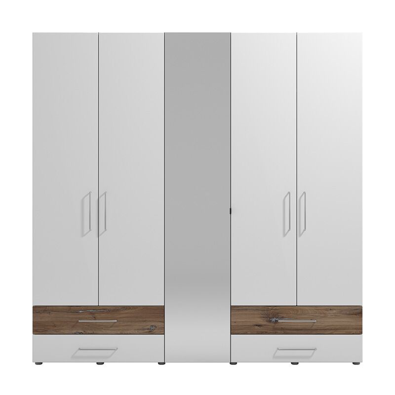 Armadio 5 ante battenti e 4 cassetti con specchio, bianco e quercia