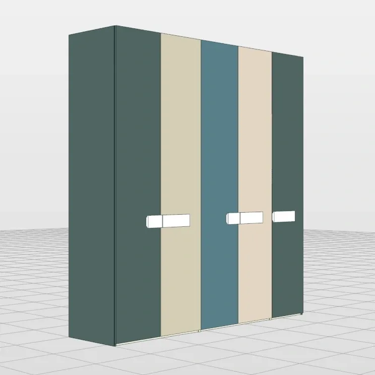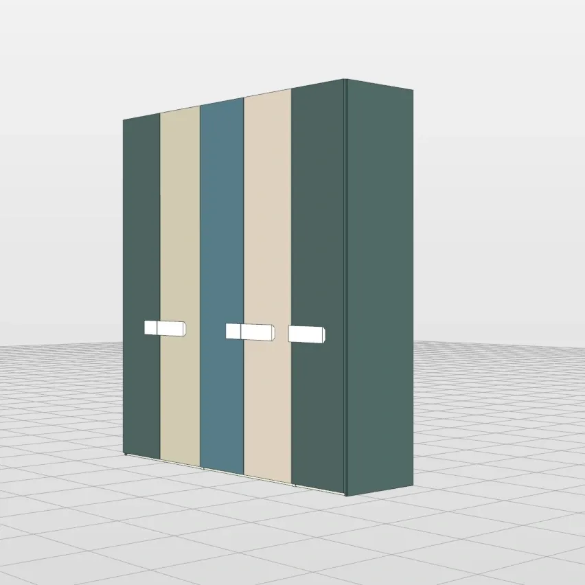 Non è il solito armadio monocromatico, ma gioca con un'alternanza di colori freschi e vivaci, disposti in un modo alternato per catturare l'attenzione: ci sono delle ante in Bristol, un colore molto rilassante e di tendenza, due ante in tinta chiara, Perla e Cotone, che addolciscono la composizione e danno un tocco di calore; infine c'è un'anta in un azzurro più intenso e vivace, il Ceruleo, che crea un bel contrasto e dà un tocco di personalità.