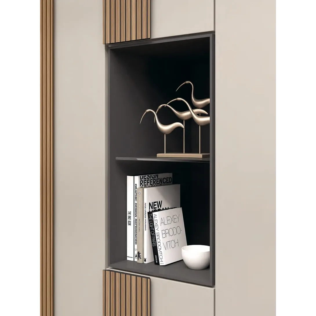 L'armadio è dotato di 5 ante battenti ed un vano centrale (36,2x50x68) con ripiano in vetro in finitura Antracite, perfetto per esporre libri e oggetti vari che personalizzano l'ambiente.