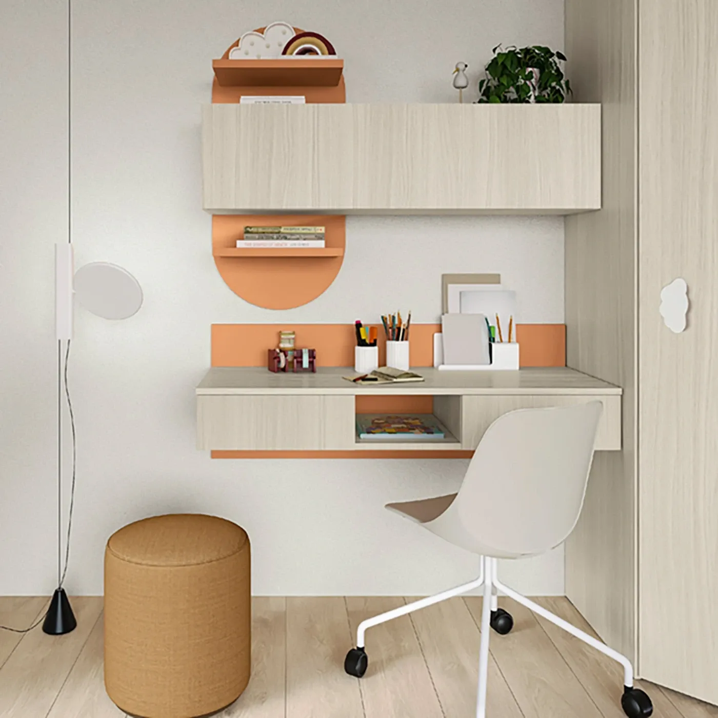 Armadio a parete con cabina angolare ad un'anta e con ponte a 5 ante e fianchi di sostegno. Al di sotto è presente un vano per farvi stare un letto oppure una scrivania.