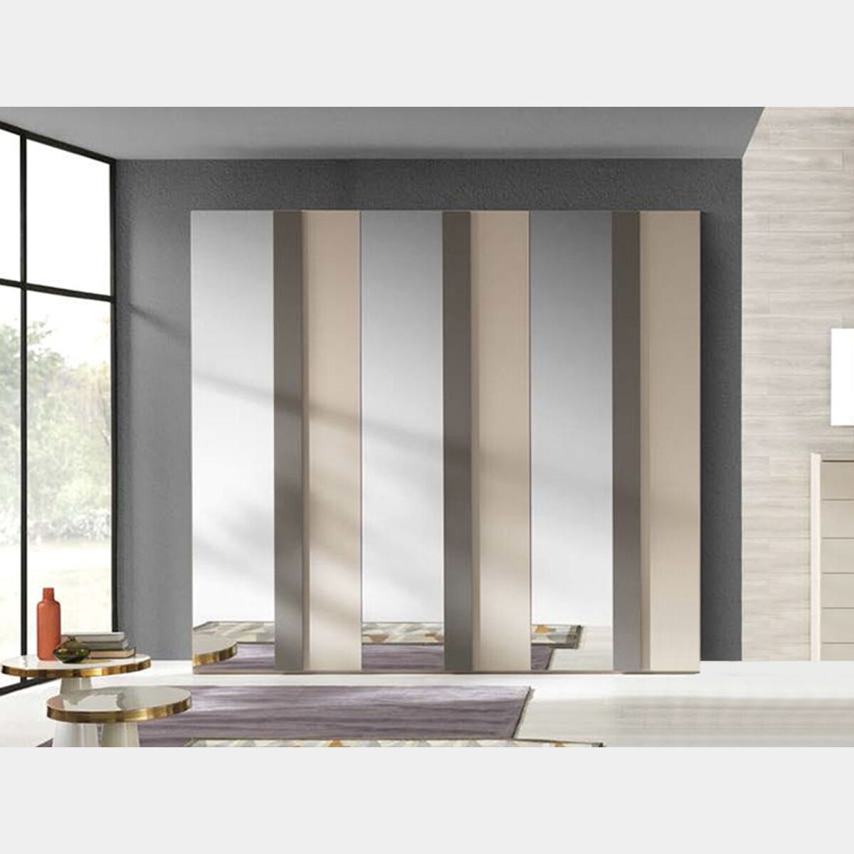 L'alternanza di finiture in Grigio londra e Cachemire crea un gioco di colori tale da consentire all'armadio della camera da letto di personalizzare l'ambiente, rendendolo unico. L'armadio presenta 6 ante battenti, 3 a specchio e 3 in finitura Cachemire. Le particolari maniglie in Grigio londra percorrono tutta l'altezza dell'armadio catturando l'attenzione. L'allestimento di base prevede un ripiano e due tubi appendiabiti per anta, è però possibile personalizzarlo aggiungendo altri ripiani, servetti e cassettiere.