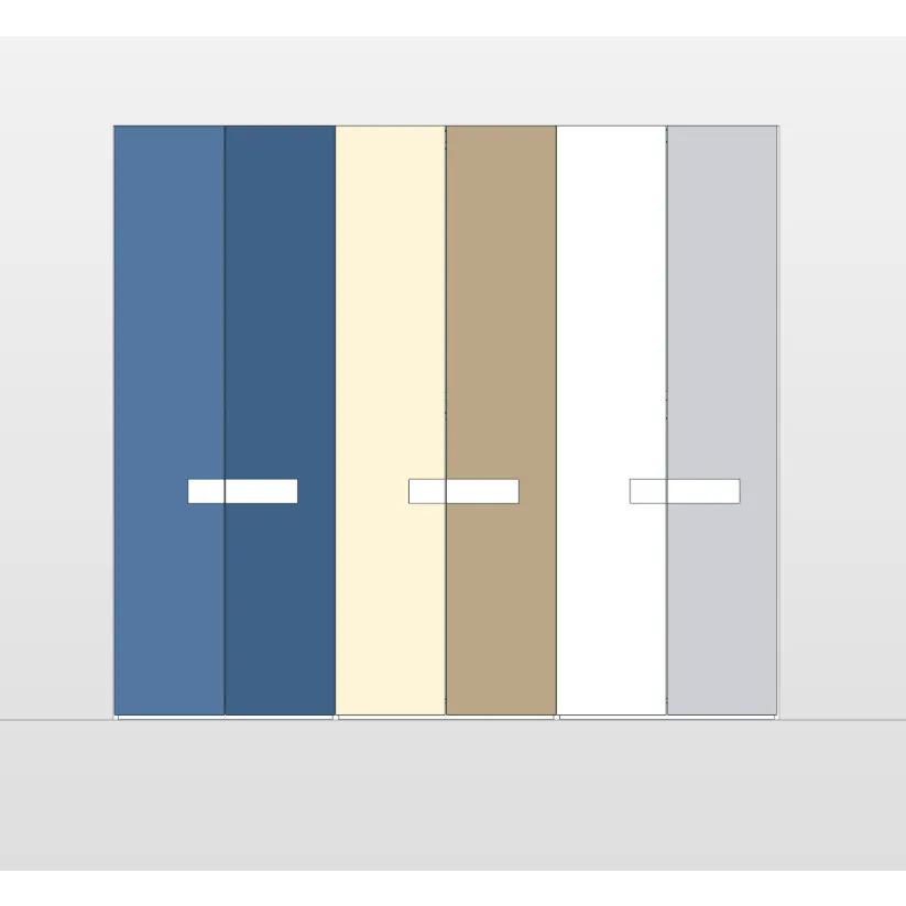 L' armadio è bello grande, con tante ante, ma la cosa più straordinaria è che ogni anta ha un colore diverso! Non sono colori accesi, ma piuttosto delle sfumature di blu, grigio, tortora, bianco... insomma, tutti colori che stanno benissimo insieme e creano un effetto "ton sur ton" molto elegante. Sembra quasi un'opera d'arte sulla parete!