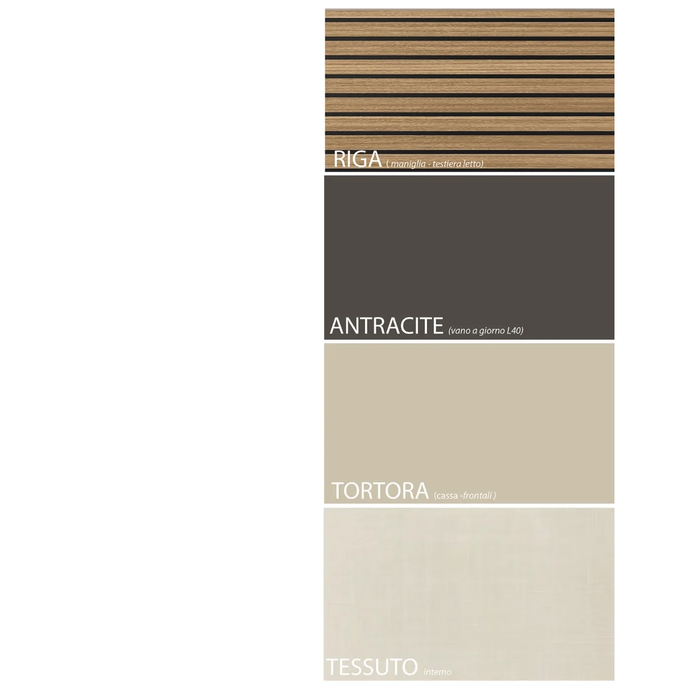 • Struttura: pannelli certificati E1, a bassa emissione di formaldeide, spessore 18 mm, nobilitato Tortora.