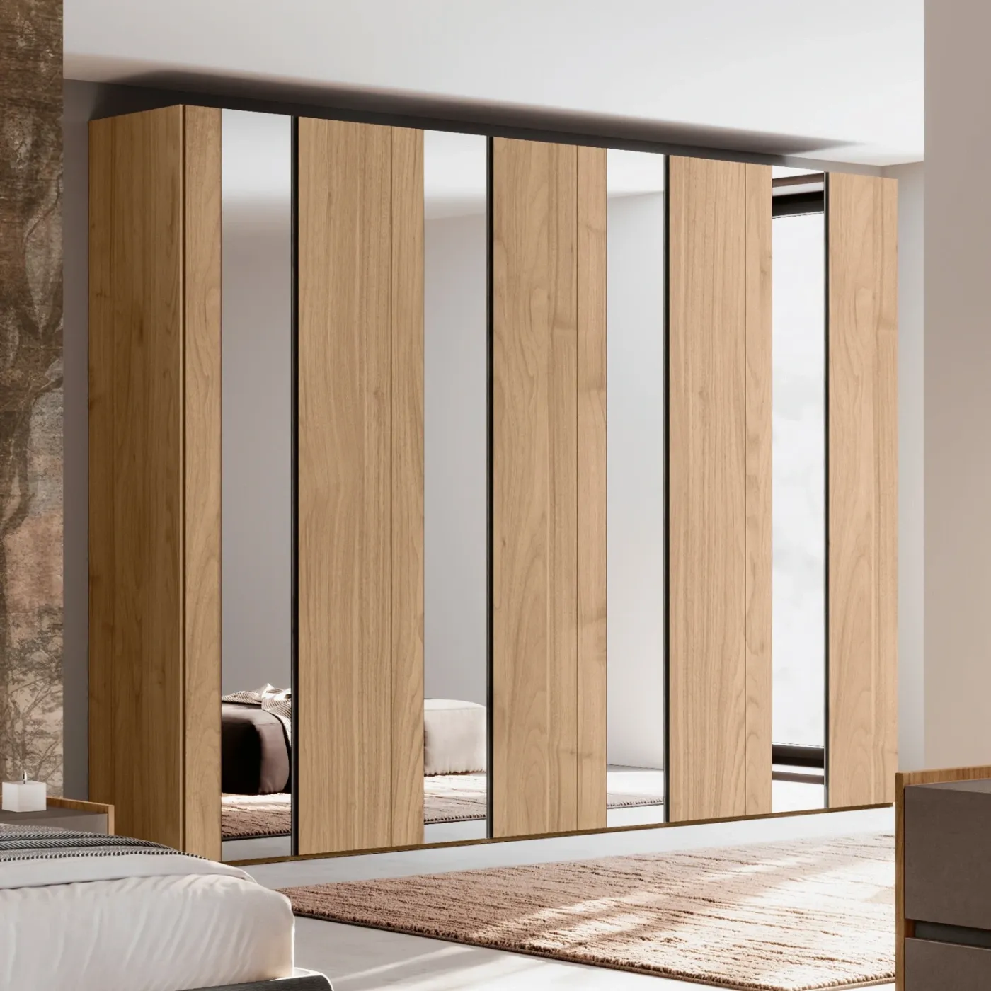 A intervallare le ante in Noce biondo ci sono degli specchi che aggiungono un tocco di luce, profondità e praticità all'intera composizione.