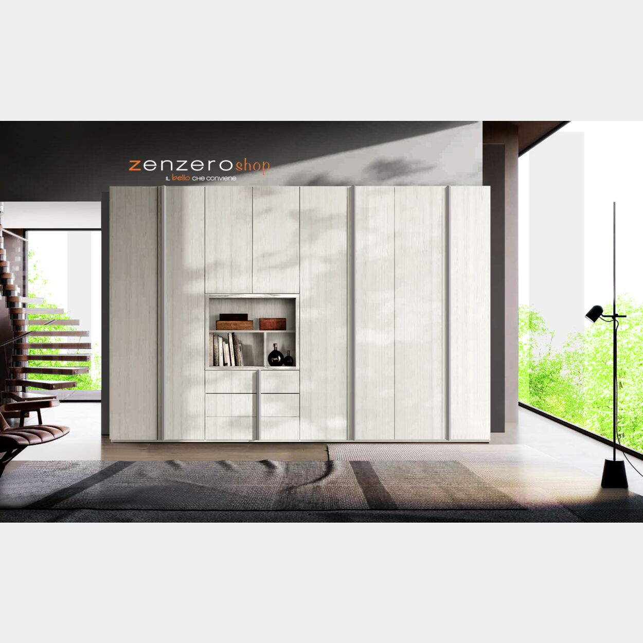 L'armadio presenta 8 ante battenti, 3 cassetti, un vano centrale con divisorio e ripiano. La suddivisione dello spazio interno contente un'ampia capienza e una totale funzionalità.