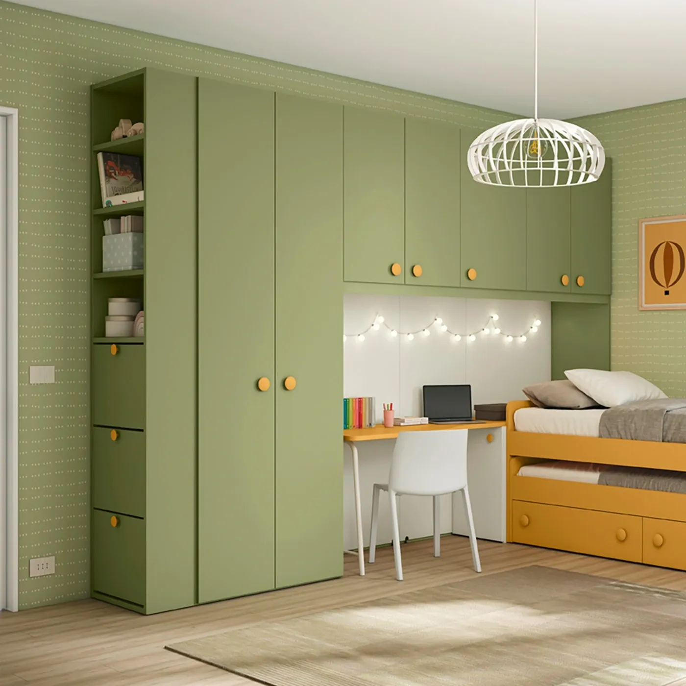 Armadio a ponte a 7 ante per camerette per ragazzi in finitura Oliva con libreria terminale. Nel vano sottostante all'articolo possono essere ospitati una scrivania oppure un letto.