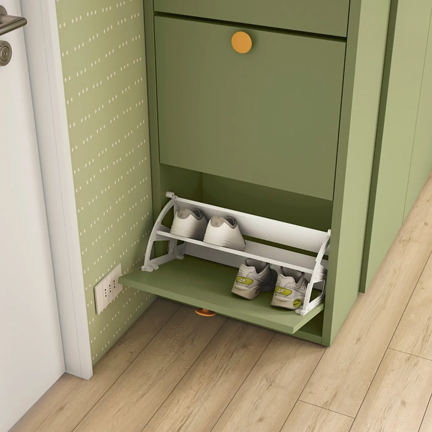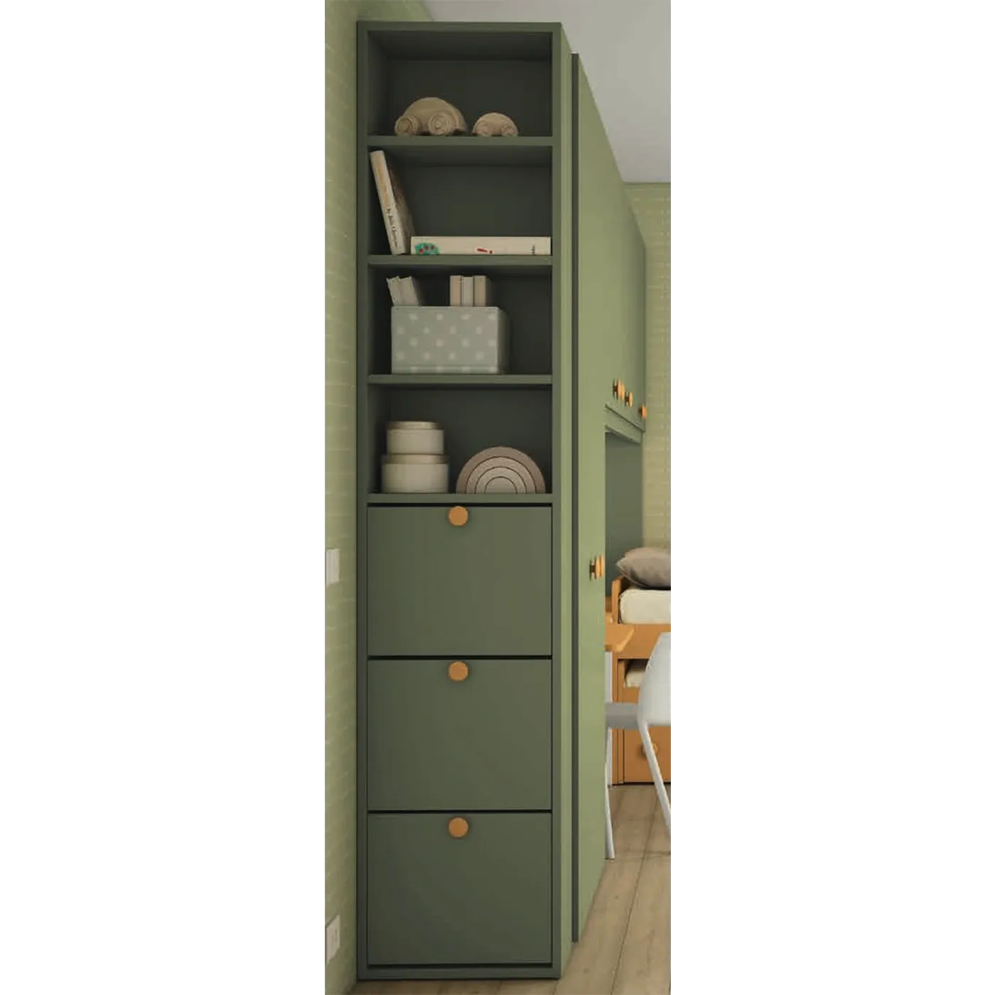 Il vano sottostante (H.169,3) è corredato da una barra, risulta in grado di ospitare un letto oppure una scrivania ed è dotato di 3 pannelli verticali qui in finitura Rovere Bianco. Viene qui presentato nella sua finitura Oliva ma, come per i pomelli, risulta possibile cambiarla e scegliere fra diverse altre nel box di selezione sottostante.