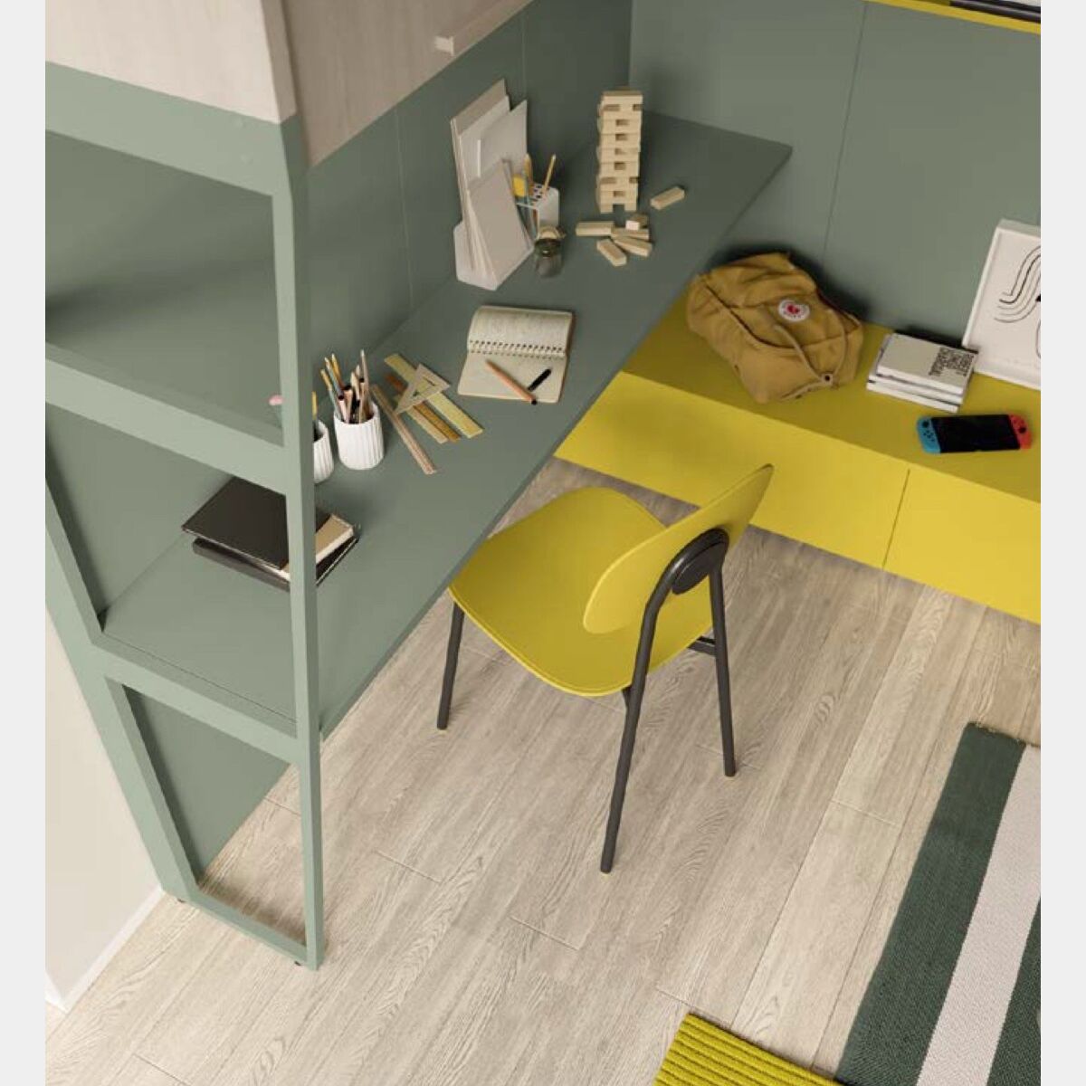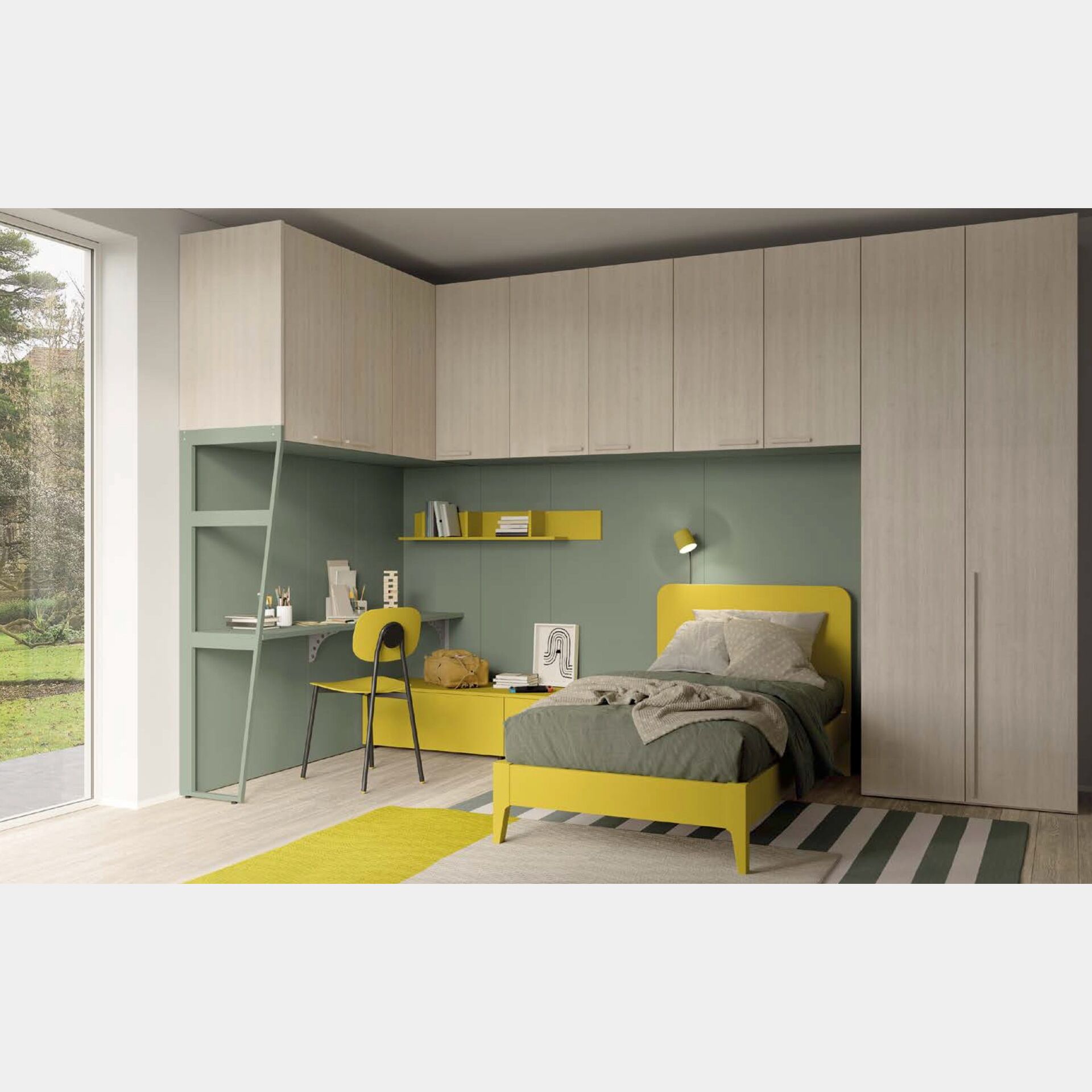 Per completare l'armadio a ponte è possibile richiedere il letto singolo, la scrivania sospesa, la mensola e la base a 2 ribalte. Anche per gli optional è possibile personalizzare la finitura (proposta Giallo zafferano).