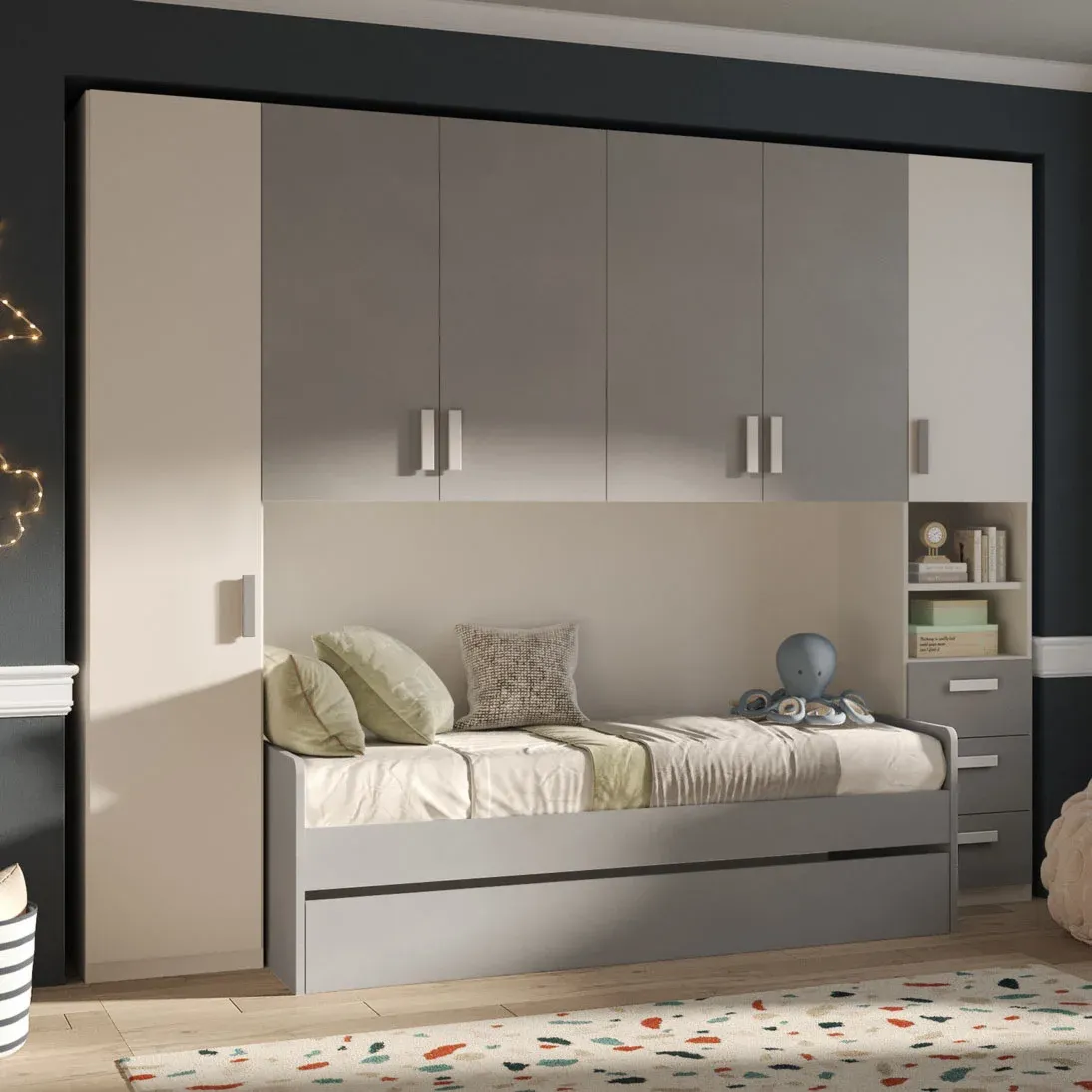 Capiente e funzionale l'armadiatura a ponte, grazie alle diverse ante, cassetti e vani a giorno, assicura un notevole spazio contenitivo, lasciando spazio per un letto inferiore.
