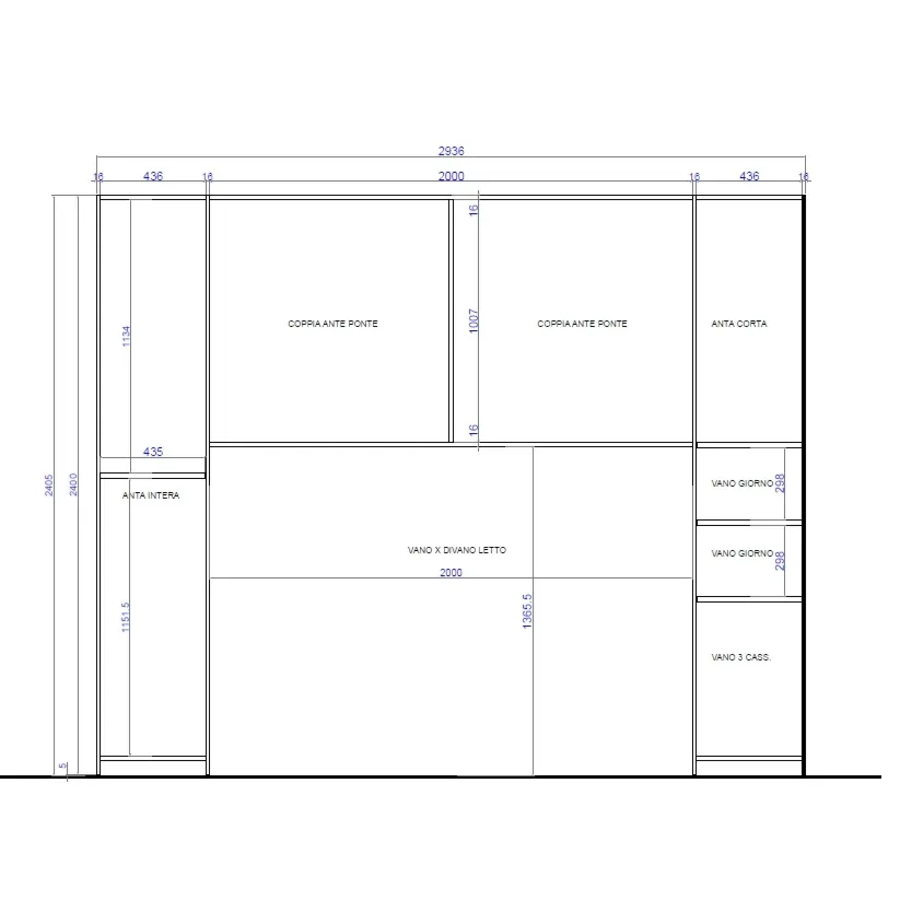Capiente e funzionale l'armadiatura a ponte, grazie alle diverse ante, cassetti e vani a giorno, assicura un notevole spazio contenitivo, lasciando spazio per un letto inferiore.