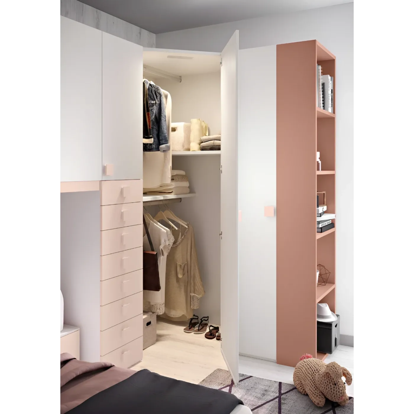L'armadio a ponte è dotato di un terminale a libreria per non lasciare in ombra il vano sottoponte, 2 moduli a ponte composti da 4 ante con apertura a libro per permettere di accedere in maniera più comoda di vani, liberando tutto lo spazio, un modulo da 45 con 8 cassetti accostato ad una cabina ad angolo ed infine un modulo da 45 cm. La libreria terminale Rosa antico è un optional.
