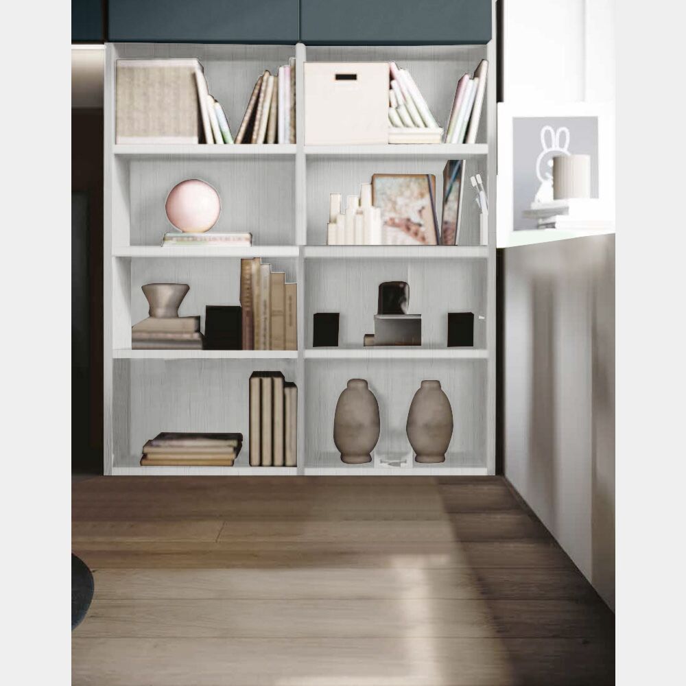 Pensata per essere funzionale al 100% la zona studio offre un ampio piano di appoggio. L'armadio presenta un modulo da 90 con 2 cestoni ed un ponte a 3 ante battenti. A lato vi è una libreria composta da 2 moduli da 60 cm: sono inoltre presenti 2 ante nella parte superiore per completarne l'estetica. L'allestimento di base prevede 1 tubo appendiabiti per vano, 3 totali.