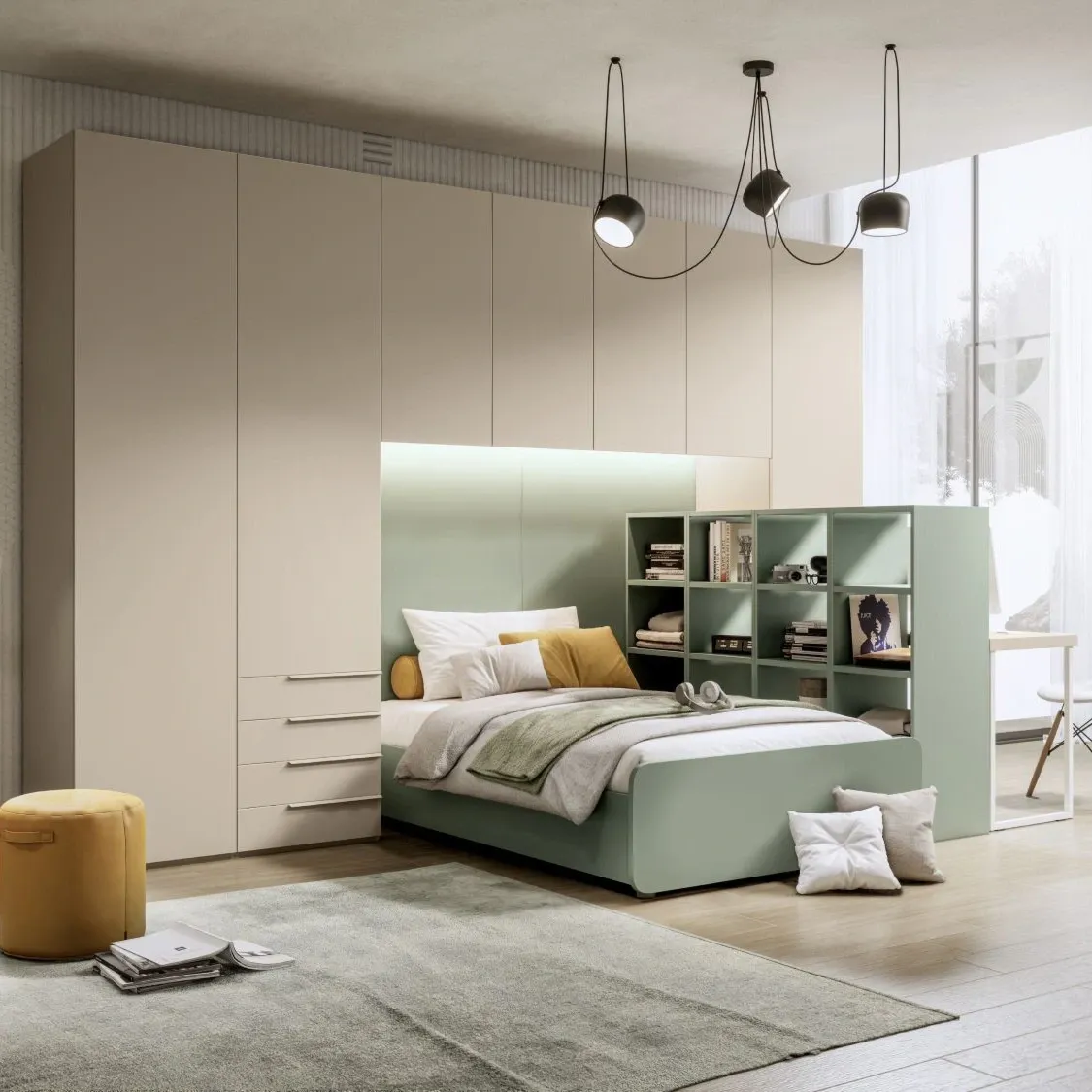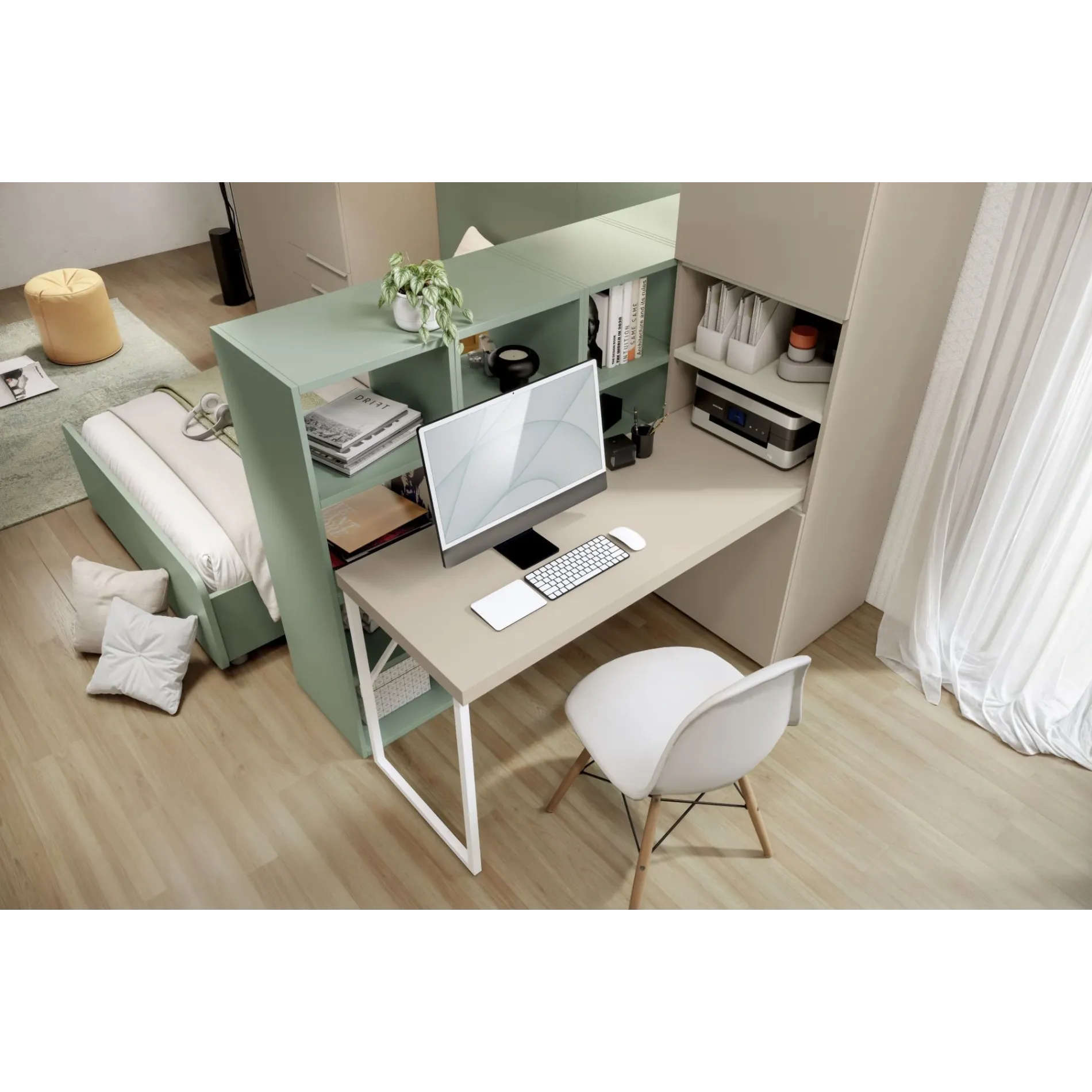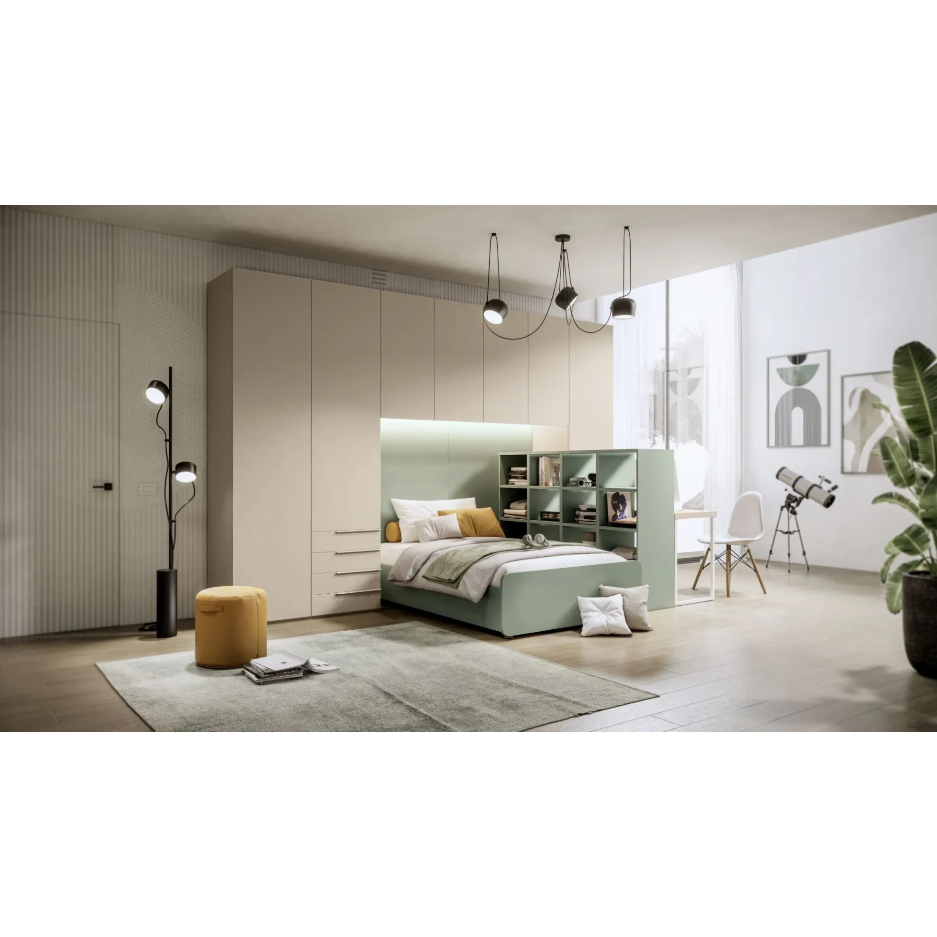 E' possibile completare la composizione richiedendo il letto ad una piazza e mezza con box contenitore, la libreria e la scrivania.