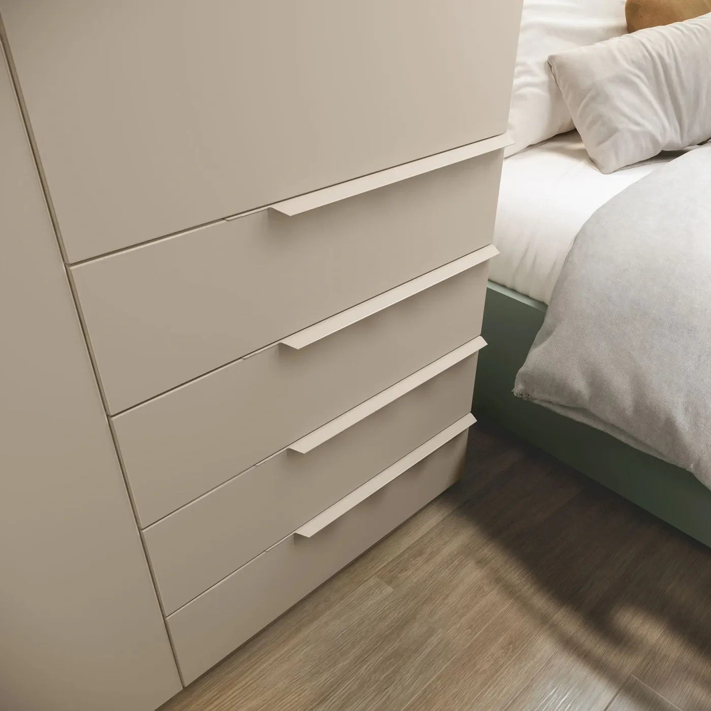 Armadio a ponte con cassetti per bambini e ragazzi personalizzabile, proposto in finitura Tortora. Scopri tutta la collezione Taz!