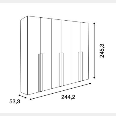 L'armadio è caratterizzato dalla presenza di 6 ante battenti suddivise in 3 vani, grazie a questa disposizione viene assicurato un'ampia capienza.