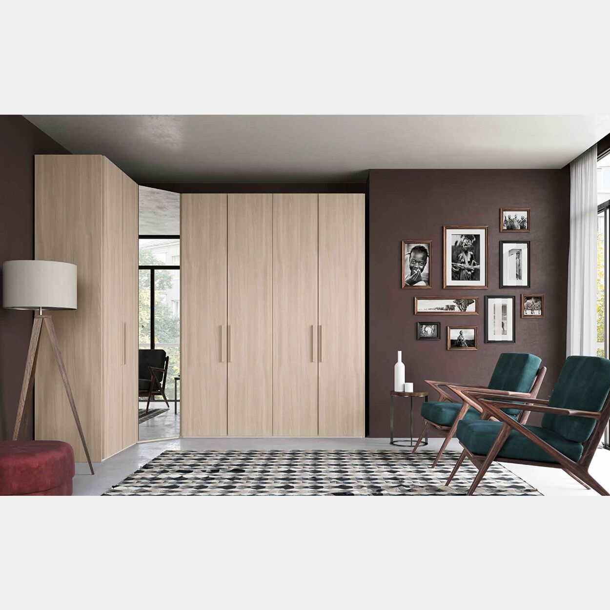 Questo progetto coniuga la massima efficienza con il miglior rapporto qualità prezzo, senza rinunciare all’estetica e ai grandi spazi. Il funzionale Armadio ad angolo è costituito da tre armadi: uno ad angolo con una sola anta a specchio, un secondo armadio a 4 ante battenti e in finitura Olmo Natura e un terzo armadio a 2 ante battenti in finitura Olmo Naruta. In totale l'armadio ad angolo arriva ad avere 7 ante battenti