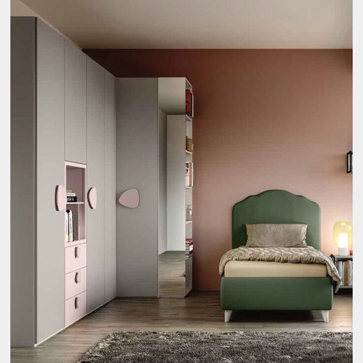 L'armadio si sviluppa su due lati, per ottimizzare gli spazi. L'angolo creato offre un ulteriore piano di appoggio per vestiti e giochi lasciando al contempo la possibilità di giocare in tutta comodità e sicurezza. La libreria terminale, il vano a giorno e l'anta fissa specchio sono elementi che valorizzano la cameretta per assicurare un complemento d'arredo unico e ricercato, offrendo praticità e comfort nell'utilizzo quotidiano.