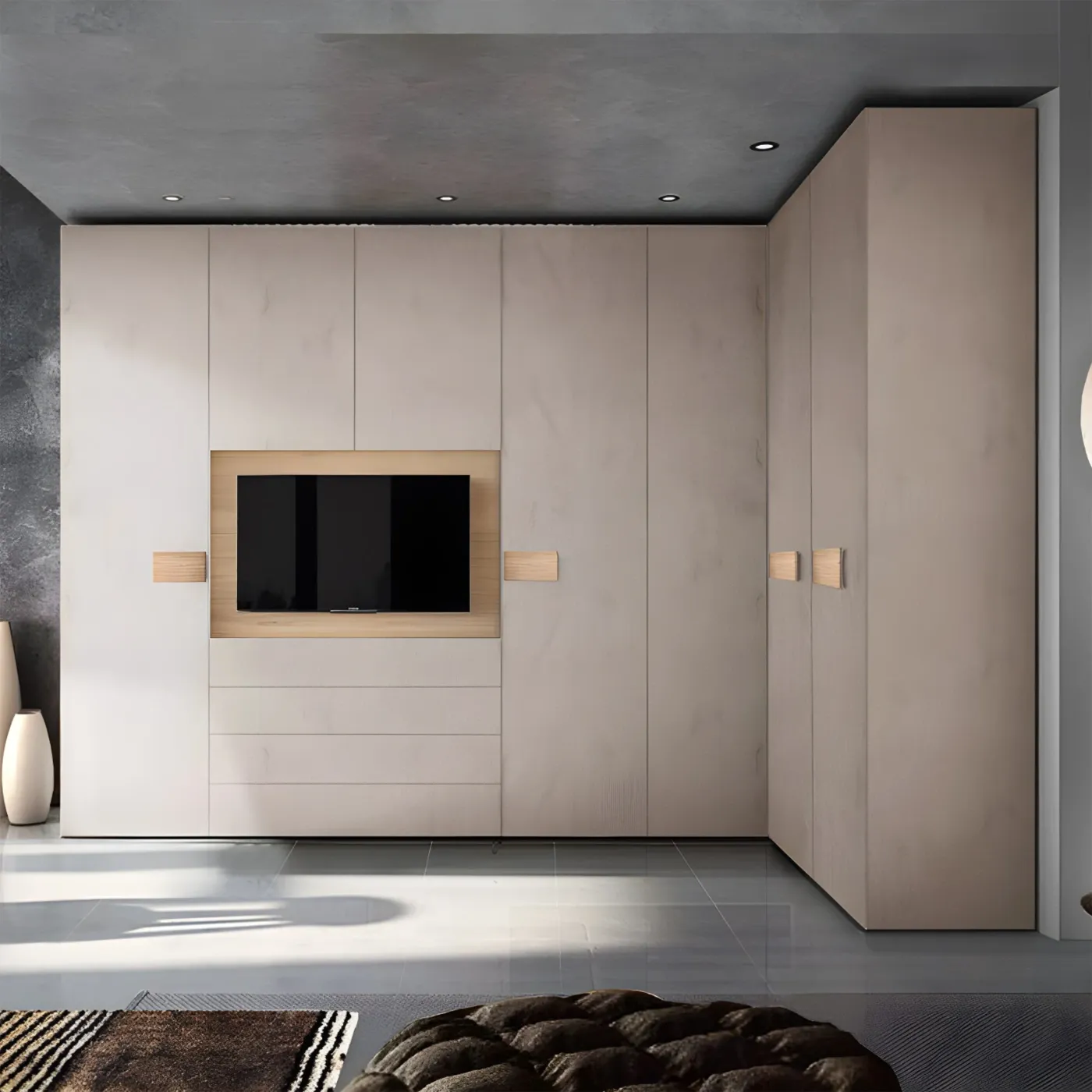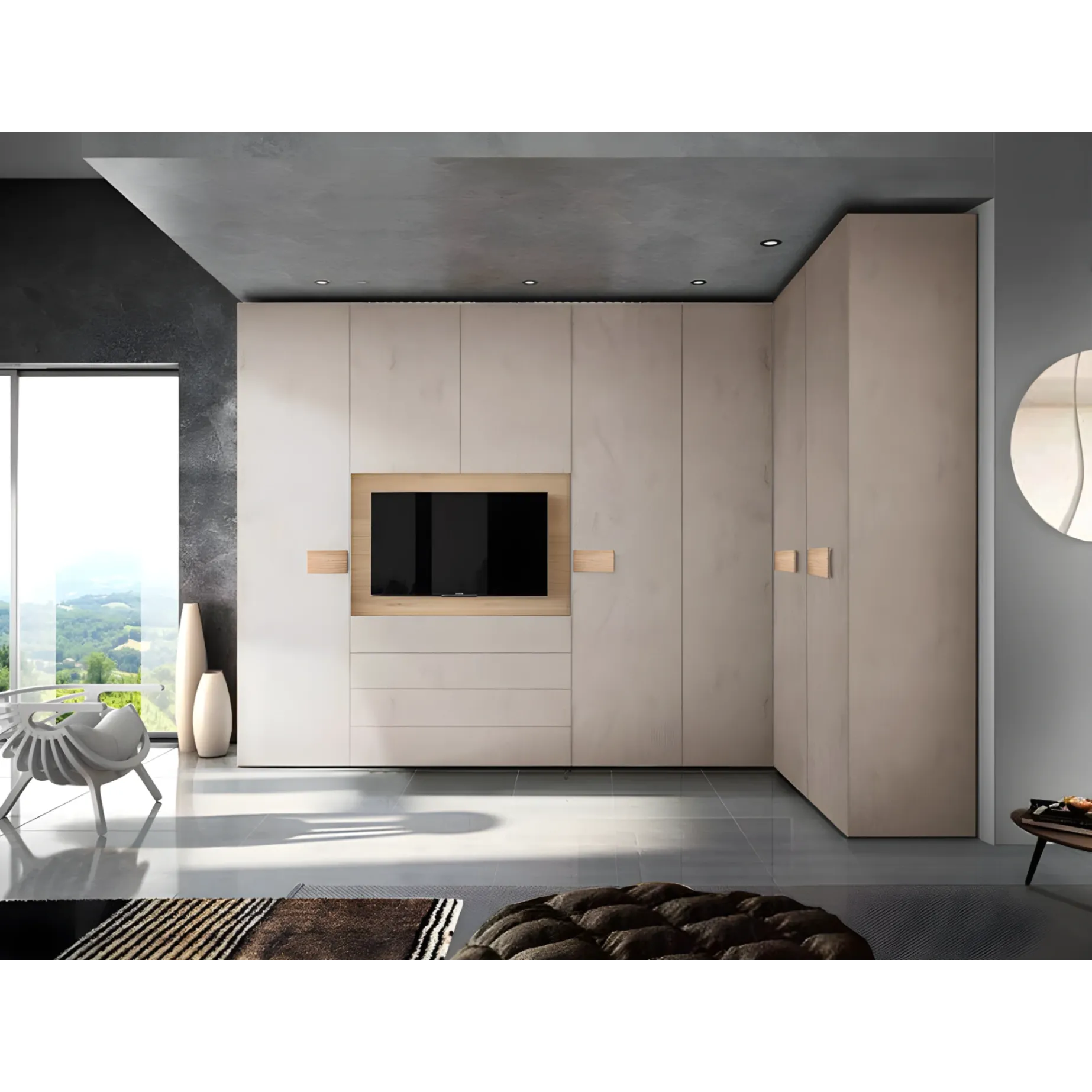 Armadio angolare con vano tv, Argilla e Noce biondo, collezione Island