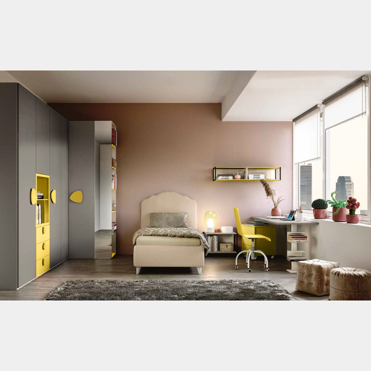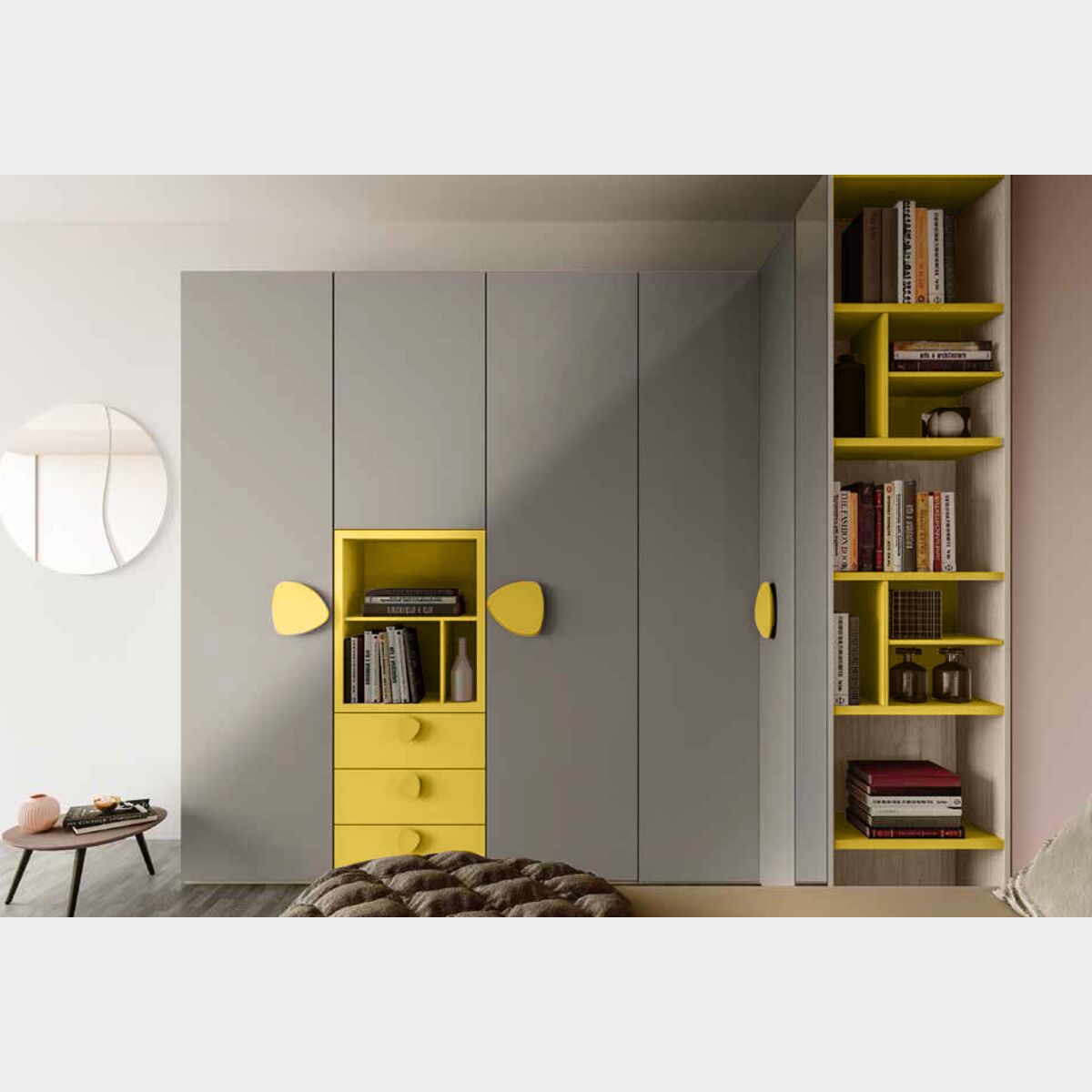 L'armadio è pensato per camerette allegre e moderne: le calda finitura in Giallo cedro si mesola al Grigio cenere per creare un contrasto acceso che mette in risalto l'armadio nell'ambiente.