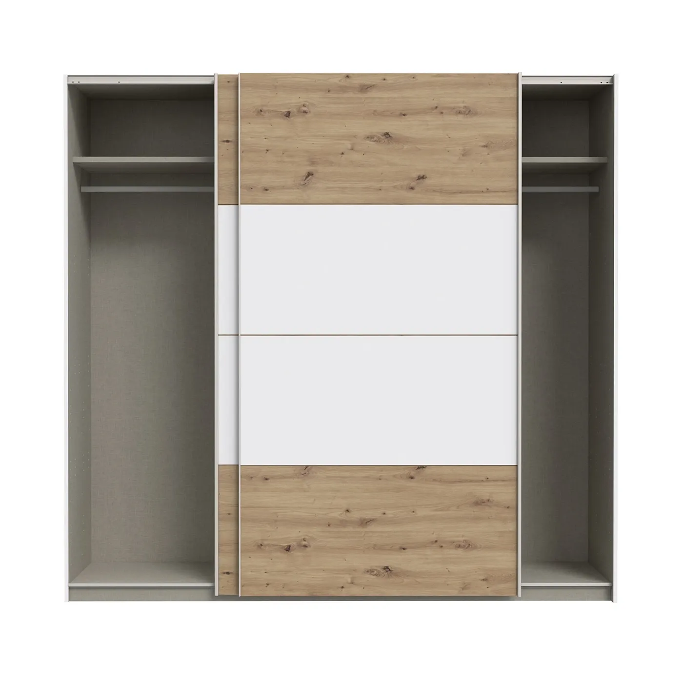 L'allestimento standard prevede un ripiano ed un tubo appendiabiti per anta, tramite configuratore è però possibile aggiungere uno o due set di 3 ripiani, per personalizzarne l'interno.